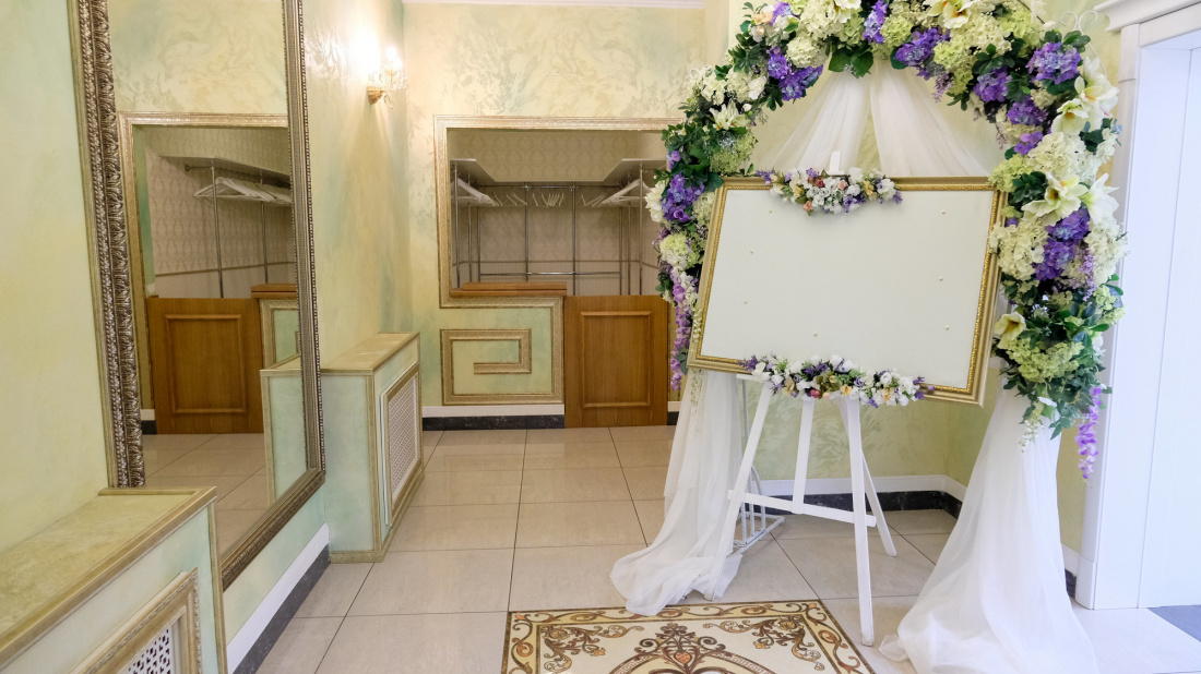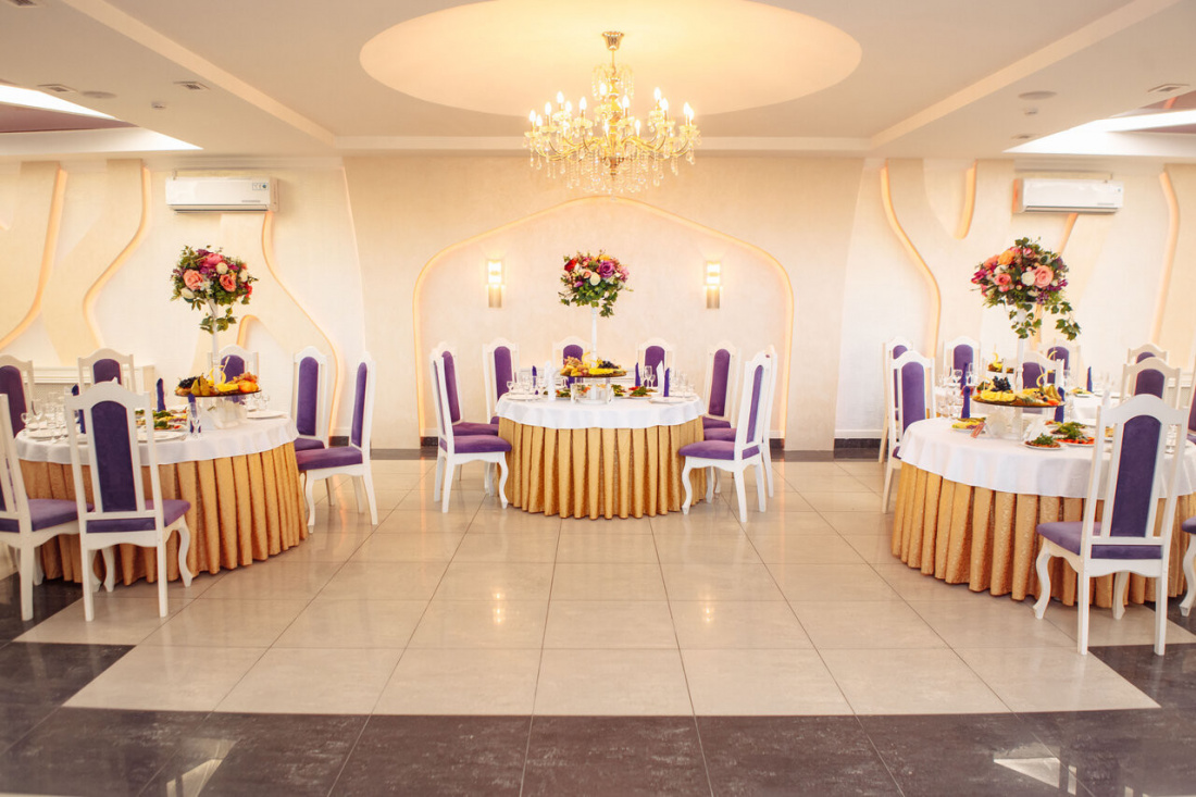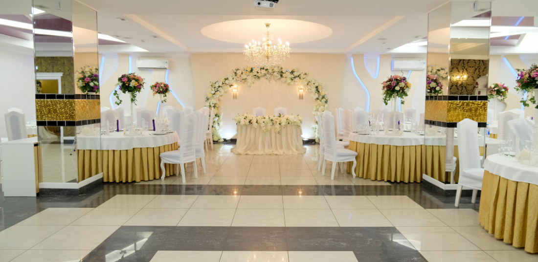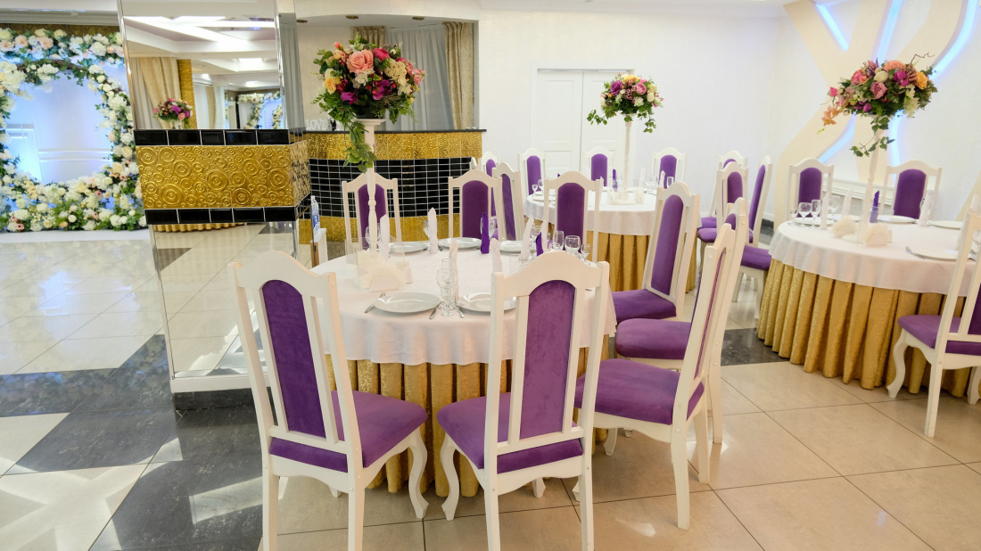 В оформлении зала используются приятные цвета тканей, сюда идеально впишутся любые цветы и подсветка. А опытная команда настоящих профессионалов помогает организовать самый лучший праздник, который останется надолго в памяти и понравится каждому приглашенному гостю.