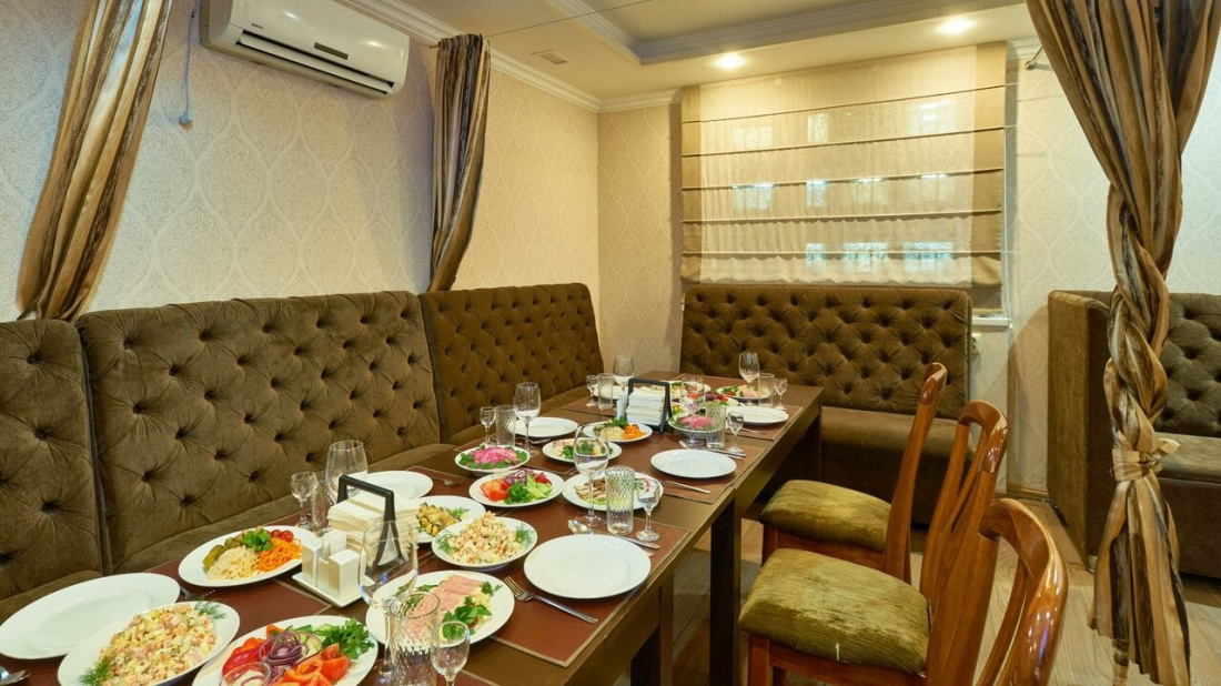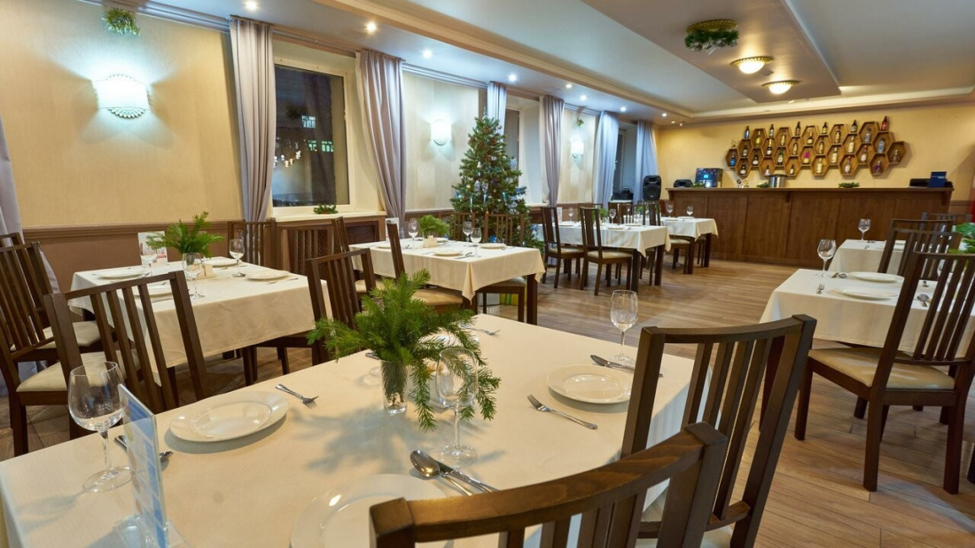 В меню представлены блюда европейской, русской и татарской кухни. Для вас приготовят шашлык из свинины, медальоны из телятины, свинину с ананасами, стейки, куриную грудку и судака по-польски, также вам непременно понравится пицца, пельмени, манты и жульен.