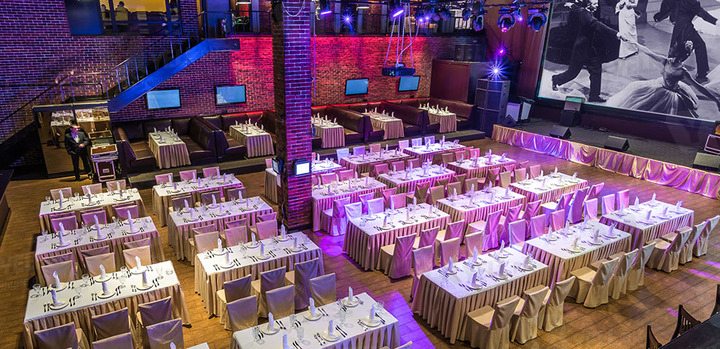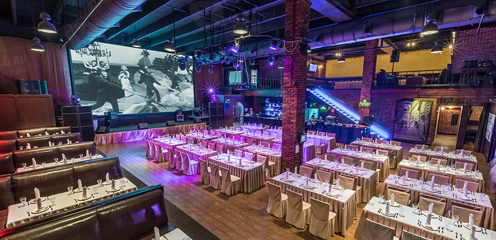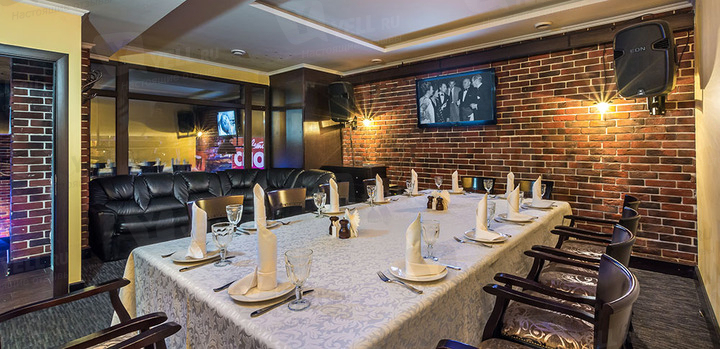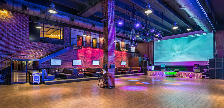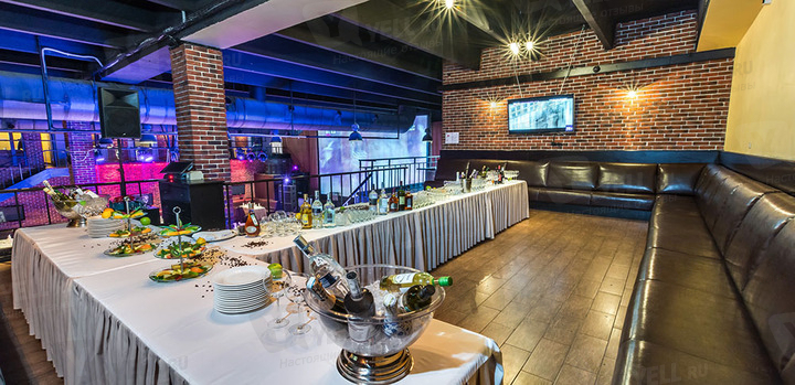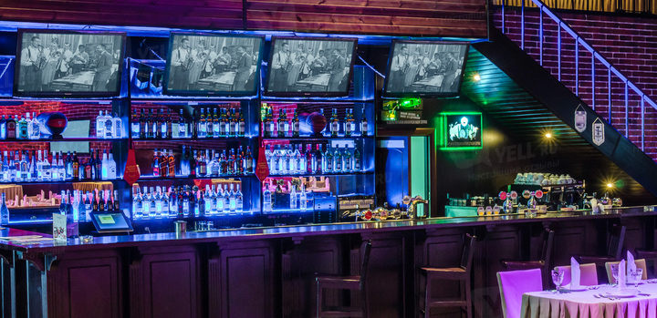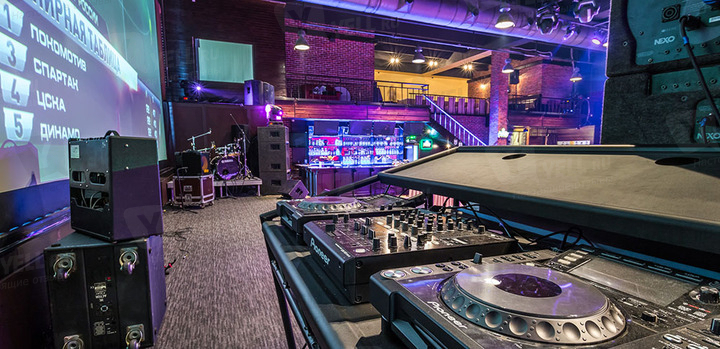 Интерьер выполнен в стиле лофт – с высокими потолками и элементами кирпичной кладки. Здесь ты сможешь смотреть спортивные матчи по гигантскому экрану. Есть небольшие залы и балконы с собственными экранами, караоке.