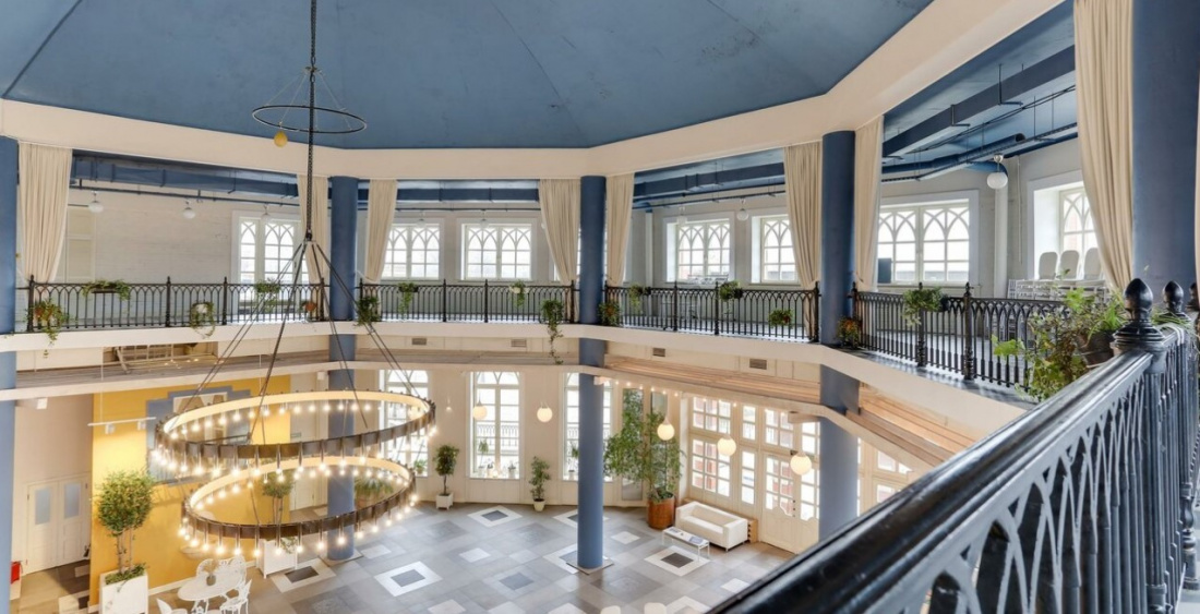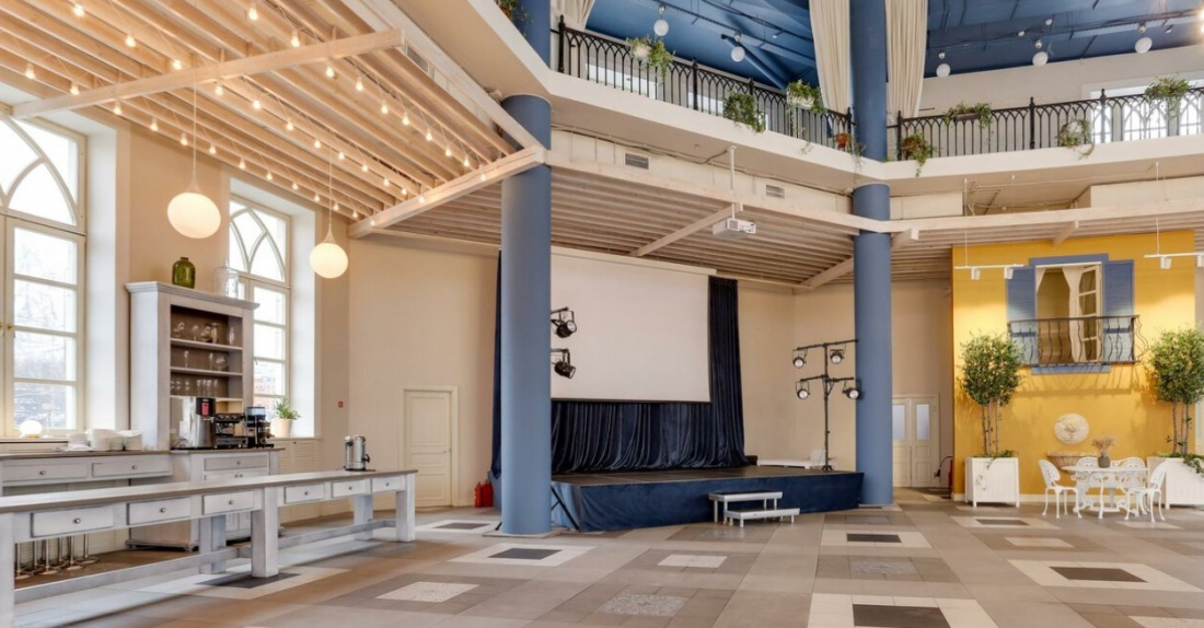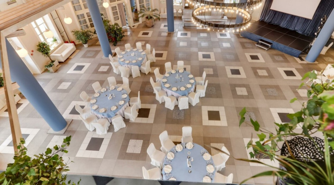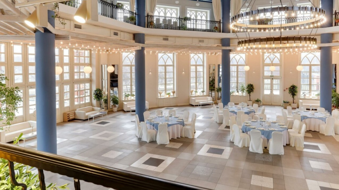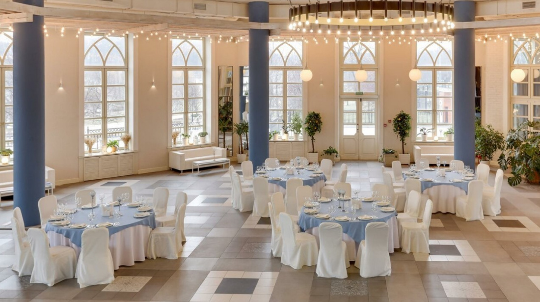 Интерьер обязательно придется по вкусу любителям классики: сочетание белого и голубого цветов, нежная подсветка, большие окна, сцена прямо в зале и много зелени. В теплое время суток можно проводить выездную церемонию на большой террасе.