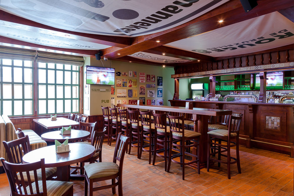 Здесь два зала – общий и для ВИП-гостей. Залы оформлены солидно, но без пафоса, в бельгийском стиле. Есть угощения для детей и недорогие бизнес-ланчи.