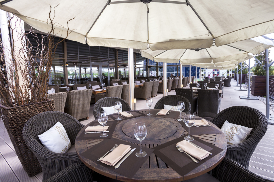 Домашний уют ресторану придают светлая мягкая мебель, галерея картин и фото на стенах, а также простые круглые абажуры подвесных светильников. Терракотовый узор на бежевом потолке плавно переходит на стену. Высокий стеллаж с винами зонирует пространство и служит украшением ресторана.