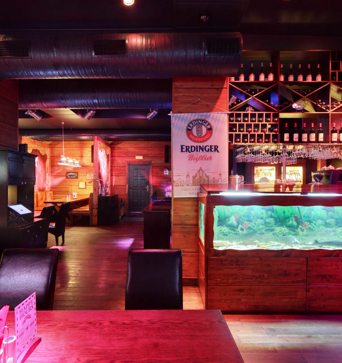 Гостей принимают у барной стойки, в уютном ресторанном зале, на летней веранде и в отдельных кабинках на 5–6 человек. Интерьер украшен чучелами животных, в стойку вмонтирован аквариум с живой рыбой. Вечером в пятницу и субботу работают музыканты.