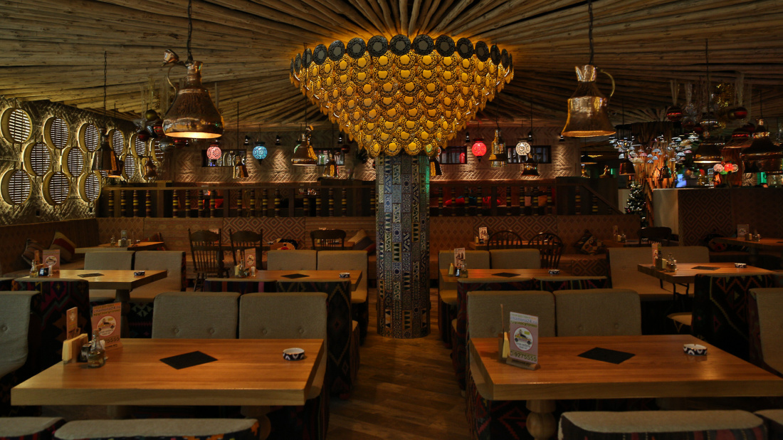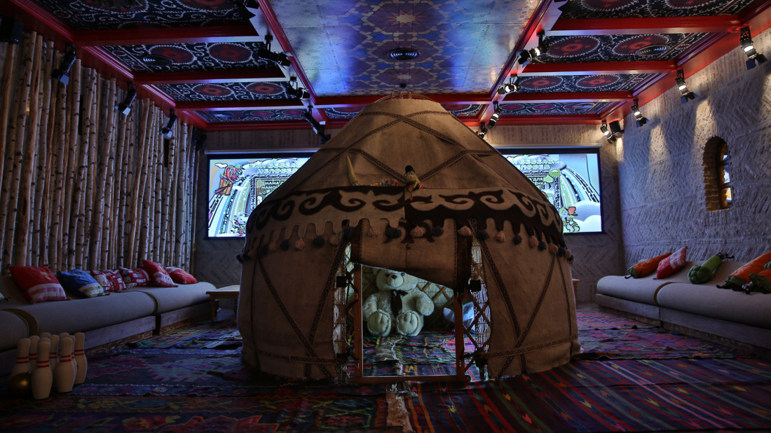 Национальный колорит чётко прослеживается в каждом из залов, где можно увидеть узбекские орнаменты, старинную восточную посуду и фрески. Для праздника можно забронировать комнаты на 60 и 200 персон, а детей отправить в игровую зону с настоящей юртой и мягкими диванами по периметру.