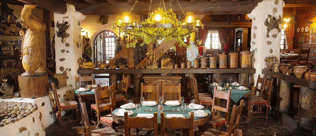 Интерьер оформлен под охотничий или сельский дом с бревенчатыми стенами, русской печью, ухватами и горшками. По выходным и в праздники кушанья гостеприимно подают на телеге – наподобие шведского стола. Здесь ценят гостей и прислушиваются к их пожеланиям.