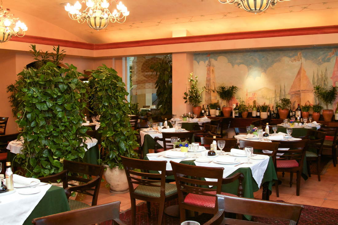 Интерьер напоминает просторную веранду ресторана, расположенного на курортном побережье Средиземноморья. Стены украшены фресками, изображающими старинный итальянский городок. В зале – изобилие вечнозелёных растений. Столы покрыты зелёными и белыми скатертями и окружены удобными креслами с деревянной основой и красными мягкими сиденьями. В тёплое время года функционирует летняя терраса. Открытая кухня привлекает внимание посетителей.