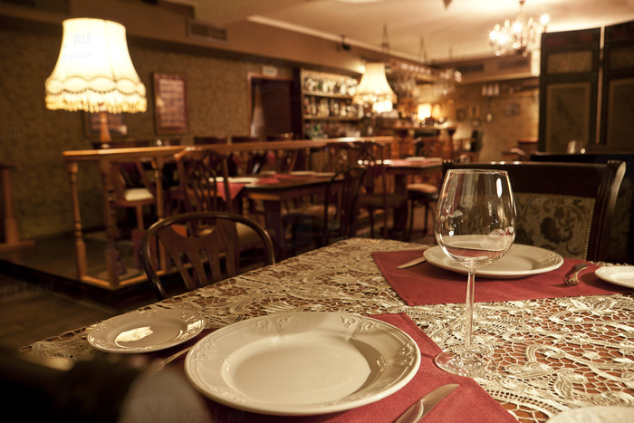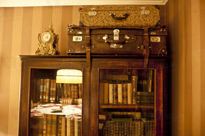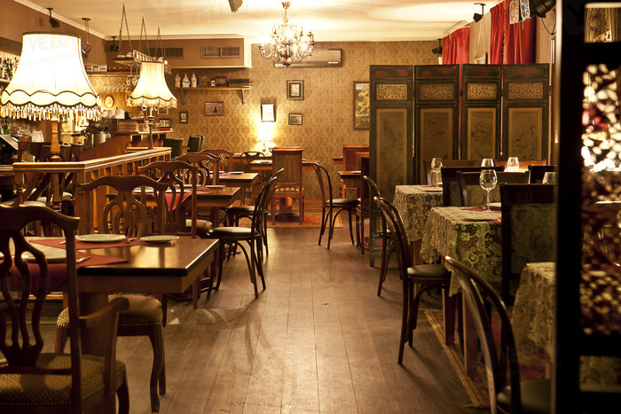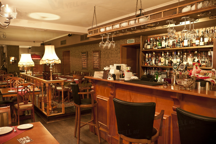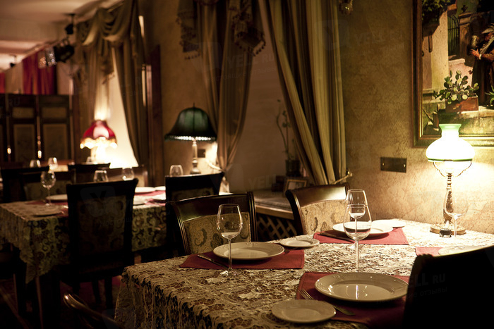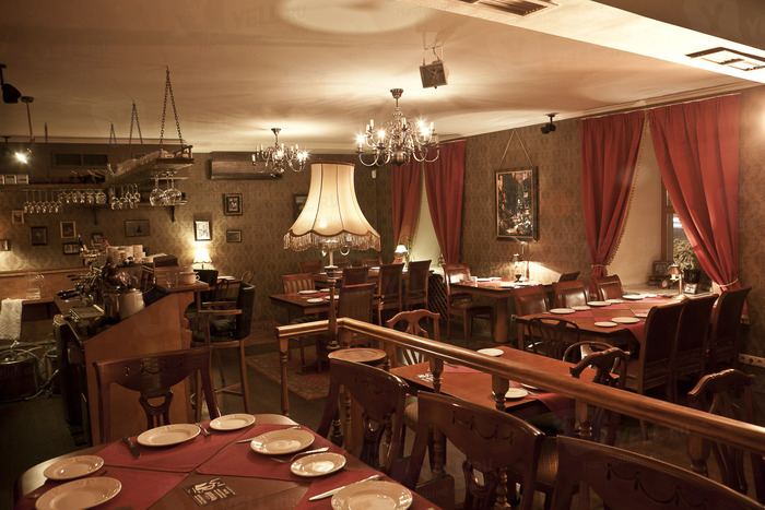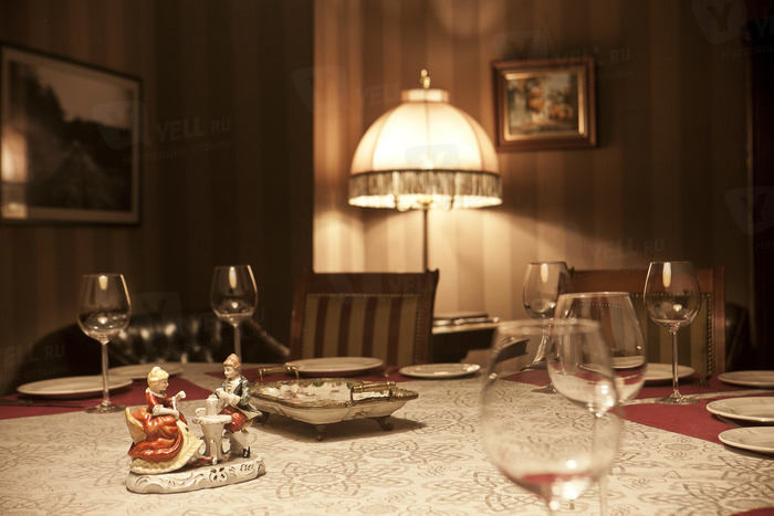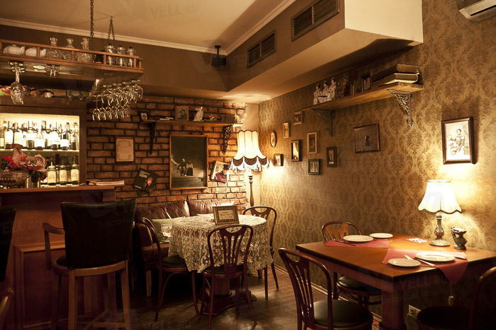 Возврат в прошлое обеспечивают антикварные предметы интерьера, раритетные фотографии и зеркала. В одном из углов ресторана стоит старинный сервант с книгами, на котором сверху лежат старые чемоданы. На столиках и под потолком можно увидеть ретро-лампы с текстильным абажуром.