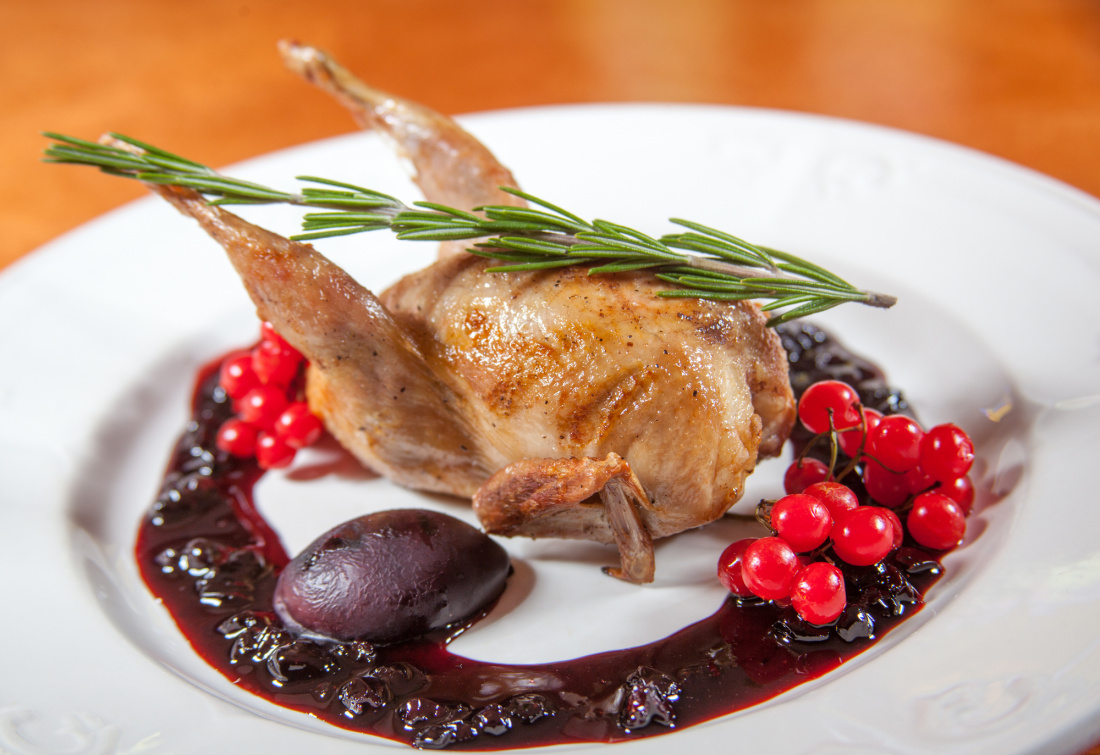 Акцент меню – это дичь, приготовленная под соусами из грибов, ягод и таежных продуктов. В баре можно заказать ерофеич и ратафию, а на закуску отведать стерлядку под соусом, мясо яка, косули, медведя.