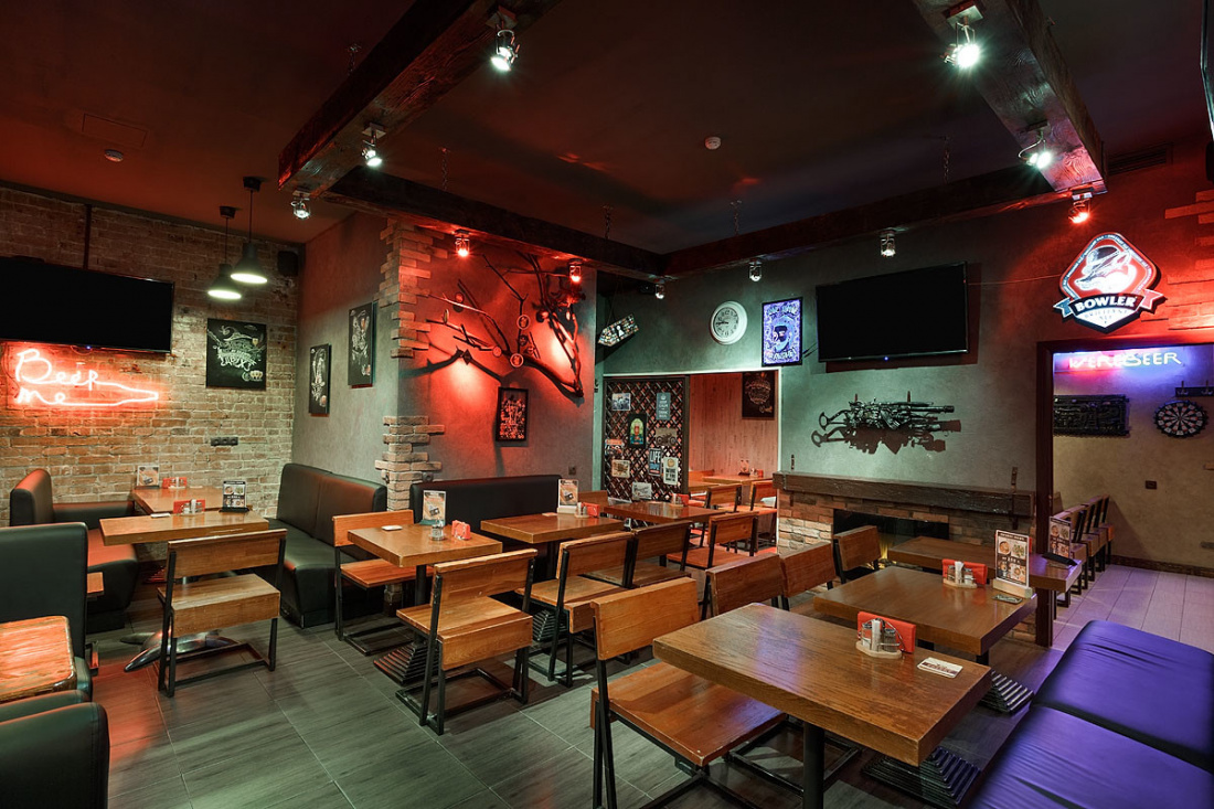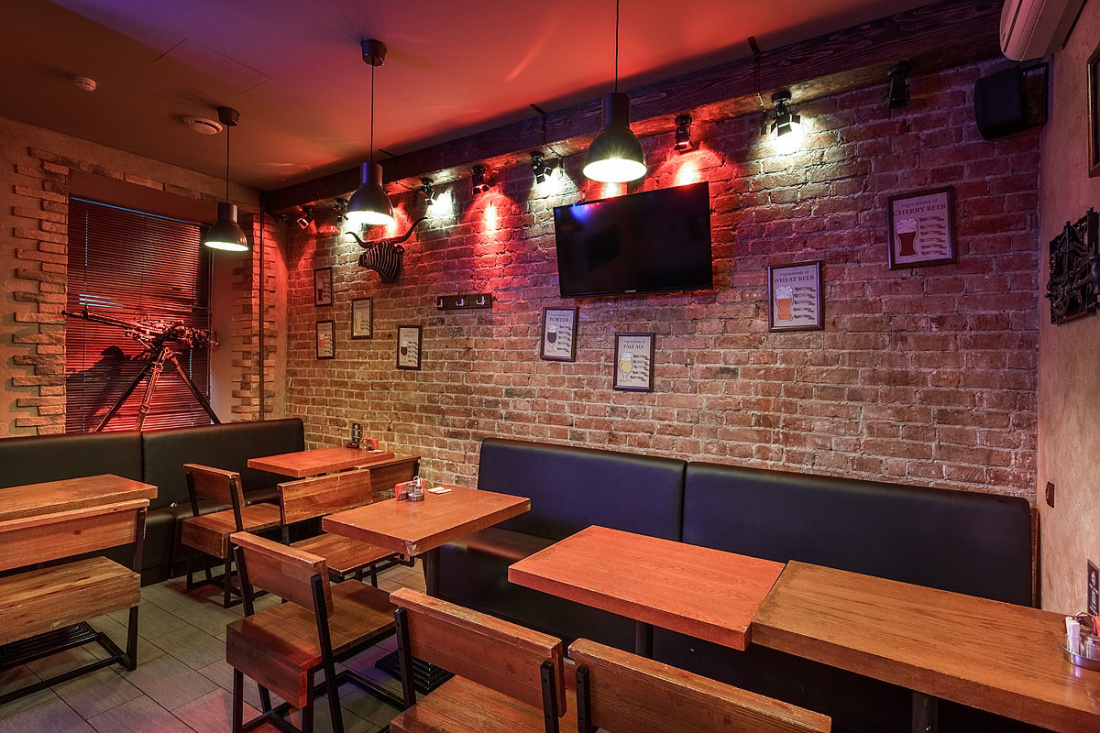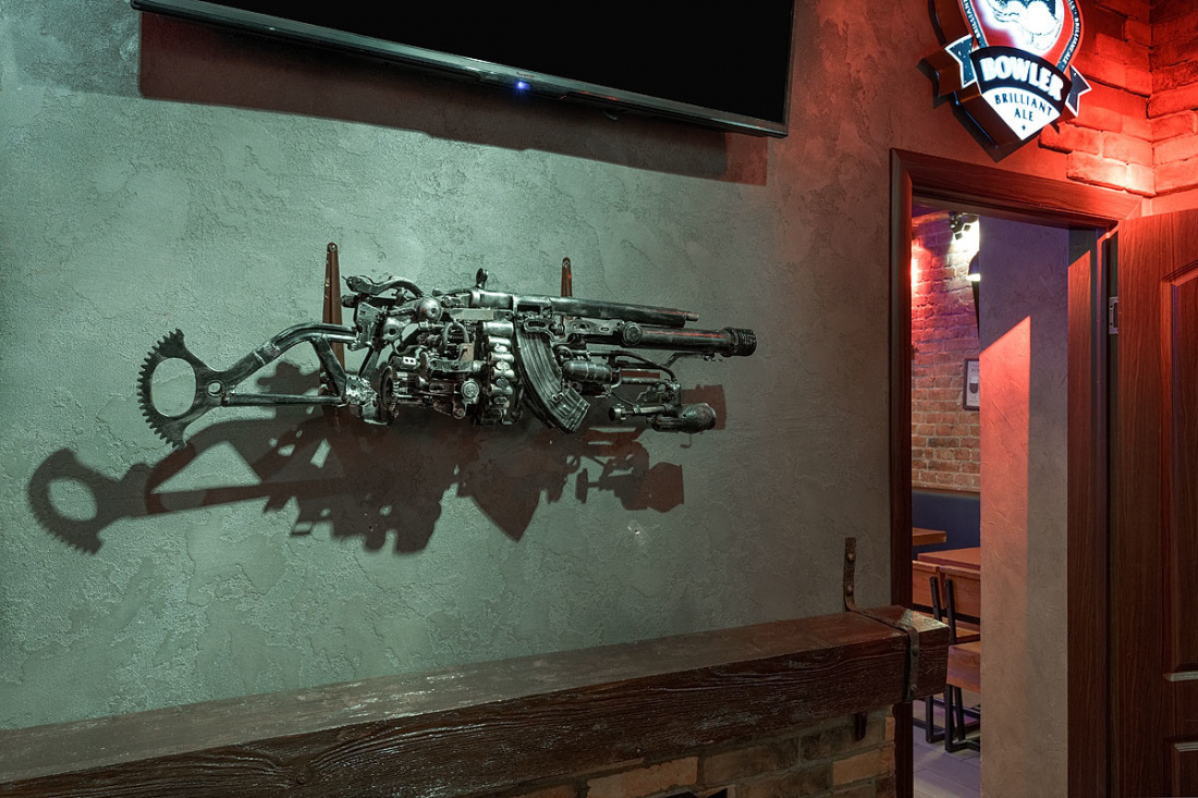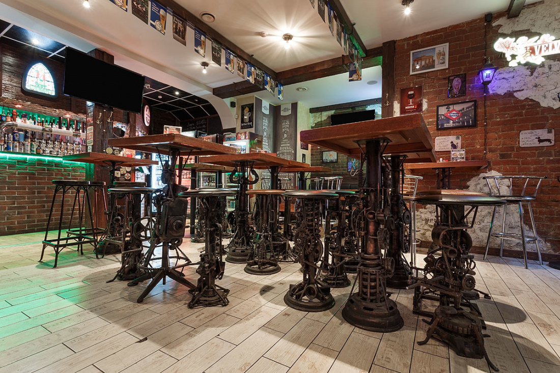 Большое пространство паба поделено на несколько зон, оформленных в едином стиле. К услугам гостей три зала, в каждом из которых есть плазменные экраны. Лофт со стимпанком создаёт атмосферу брутальности и мужского характера. Лаконичную геометрию, мебель из дерева и кожи и кирпичные стены, актуальные для лофта, разнообразили оригинальными стульями и табуретами, сделанными из привычного дуэта дерева и металла, но основания представляют собой части механизмов с пружинам, катушками и колёсами. На кирпичных стенах, частично оштукатуренных, развесили панно из медных деталей машин и частей механизмов.