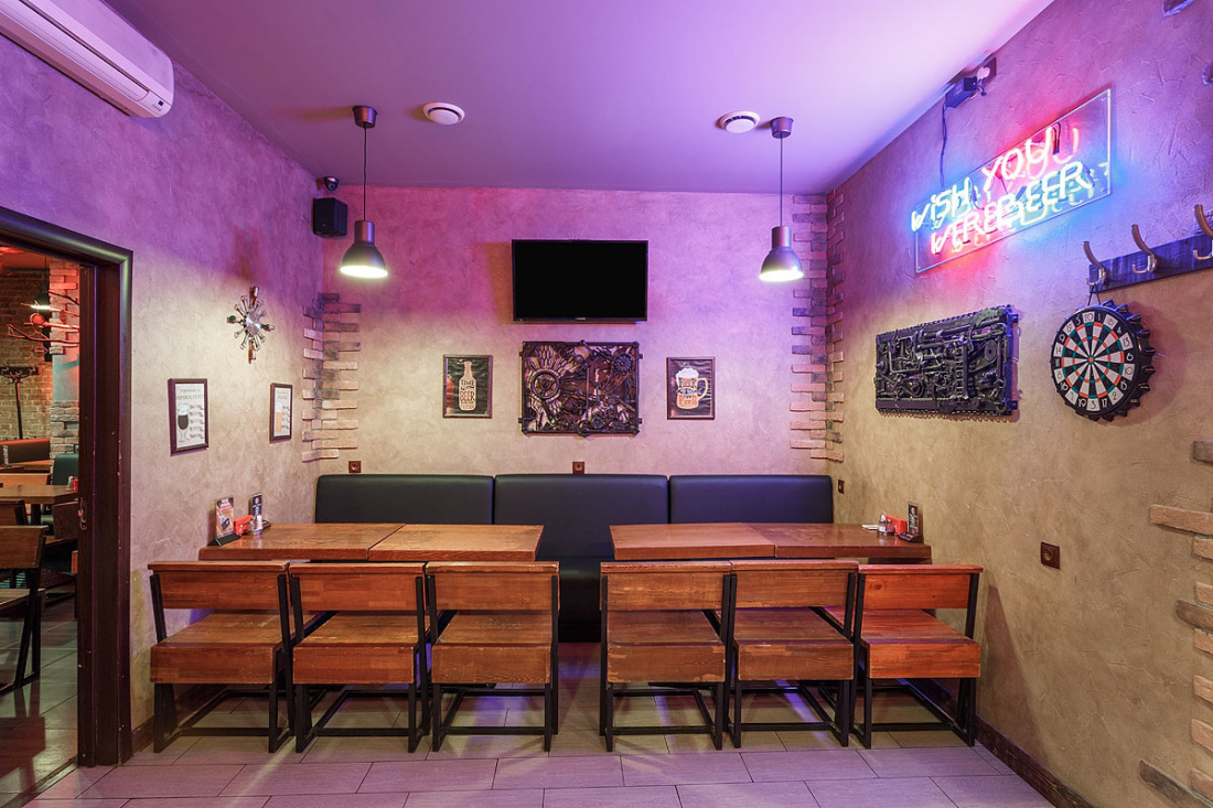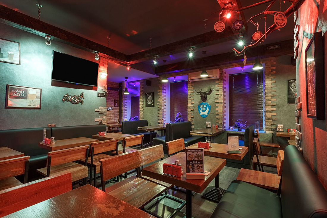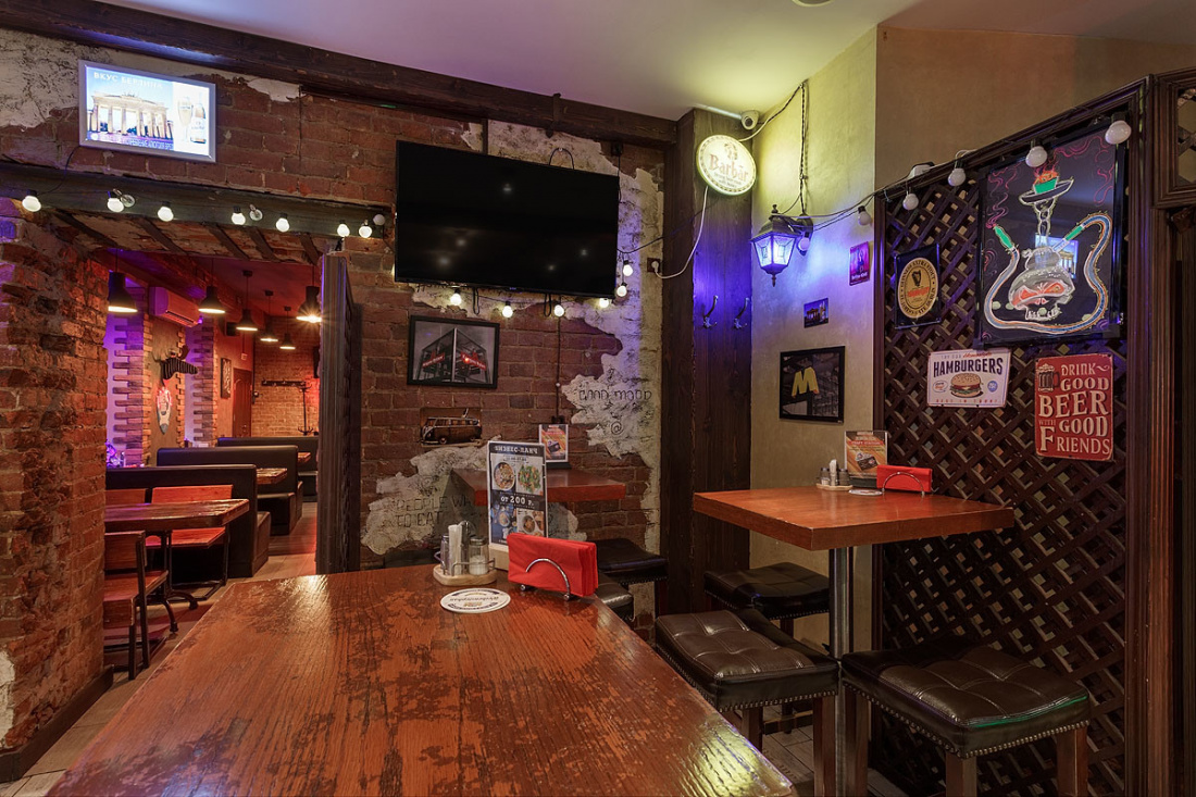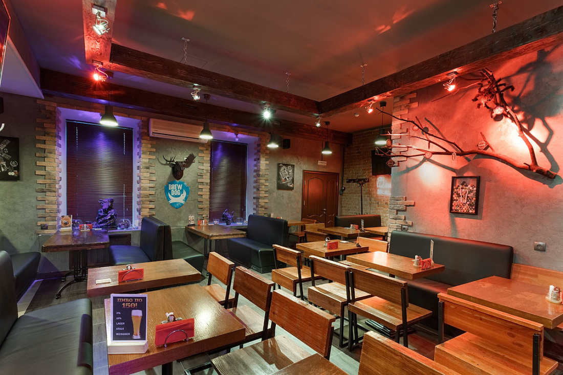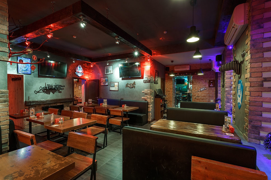 Большое пространство паба поделено на несколько зон, оформленных в едином стиле. К услугам гостей три зала, в каждом из которых есть плазменные экраны. Лофт со стимпанком создаёт атмосферу брутальности и мужского характера. Лаконичную геометрию, мебель из дерева и кожи и кирпичные стены, актуальные для лофта, разнообразили оригинальными стульями и табуретами, сделанными из привычного дуэта дерева и металла, но основания представляют собой части механизмов с пружинам, катушками и колёсами. На кирпичных стенах, частично оштукатуренных, развесили панно из медных деталей машин и частей механизмов.