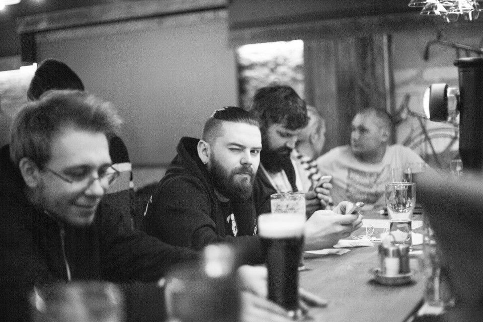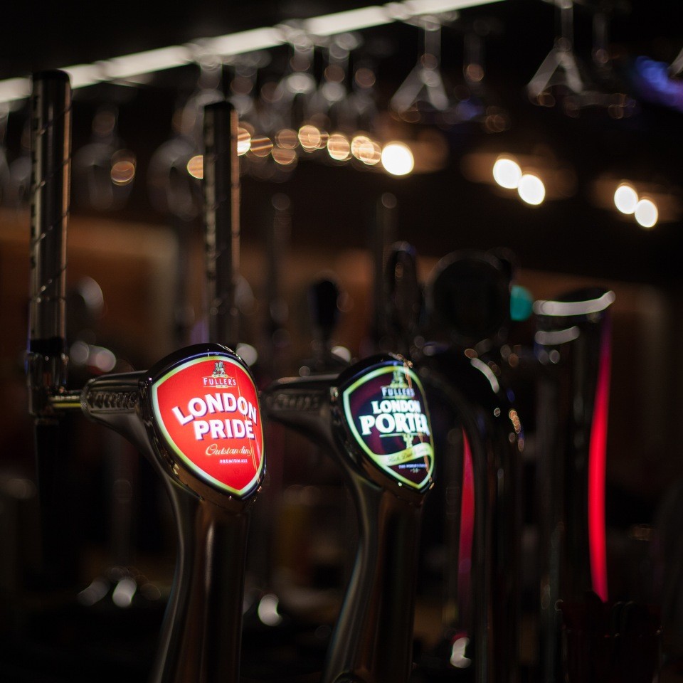 Интерьер ресторана-паба – напоминает настоящий английский паб: темное дерево, высокие столы, много стульев и места.