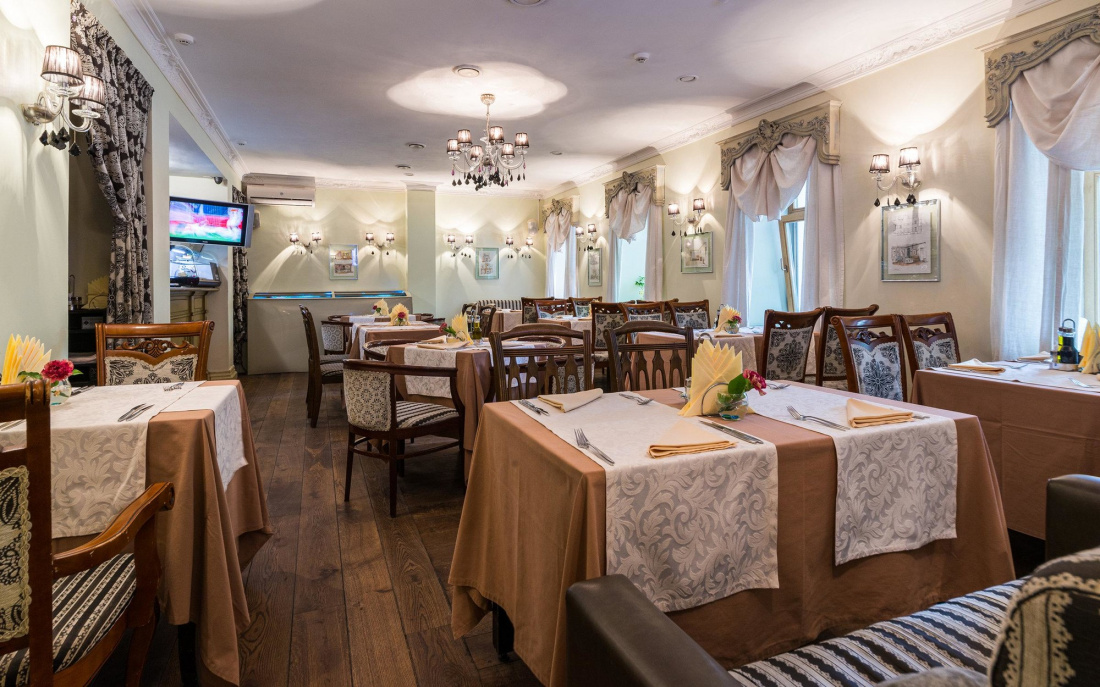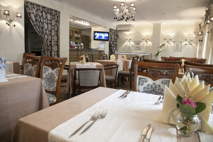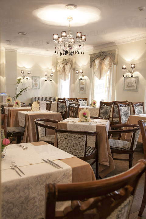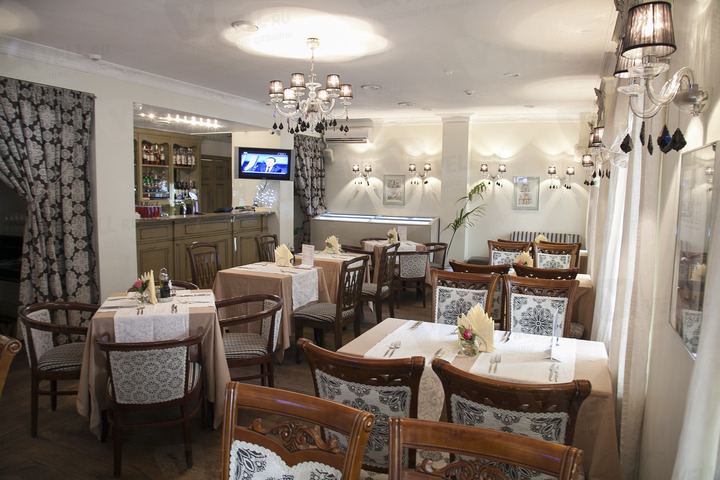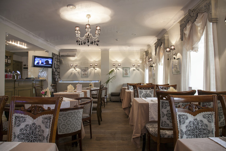 Интерьер – с фантазийными решениями: здесь антикварные стулья и зеркала и современные диваны, французский декор, на стенах – графические работы. Гости могут отведать блюда из свежих морепродуктов (есть аквариум). Заведение предложит новинки в меню, а также особенные условия для банкетов.