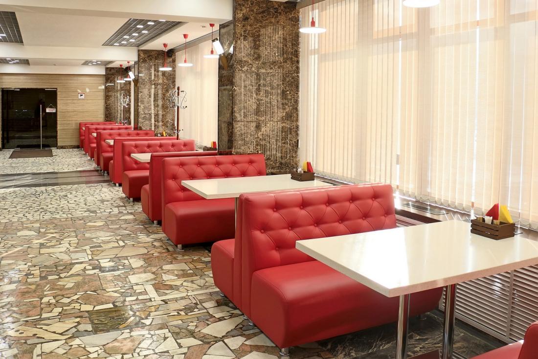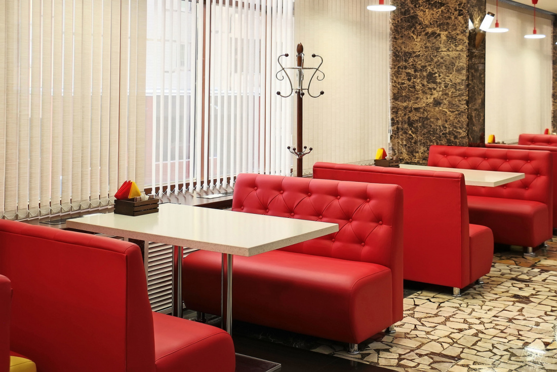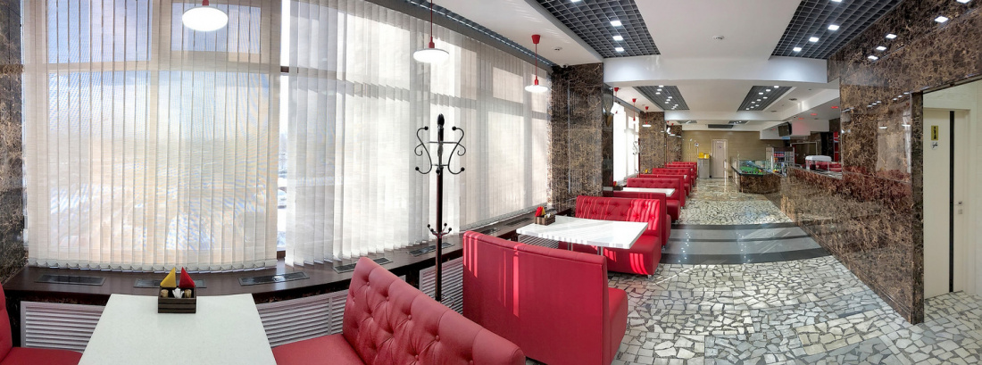 Интерьер заведения оформлен просто и со вкусом: удачное сочетание красных и светлых тонов, мягкие диванчики, «мраморные» стены и удобная барная стойка.