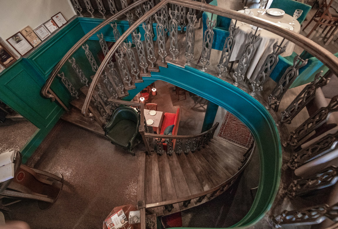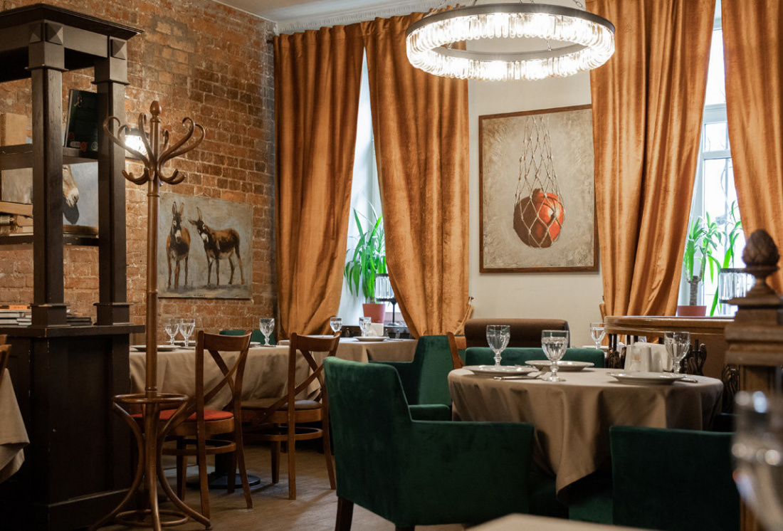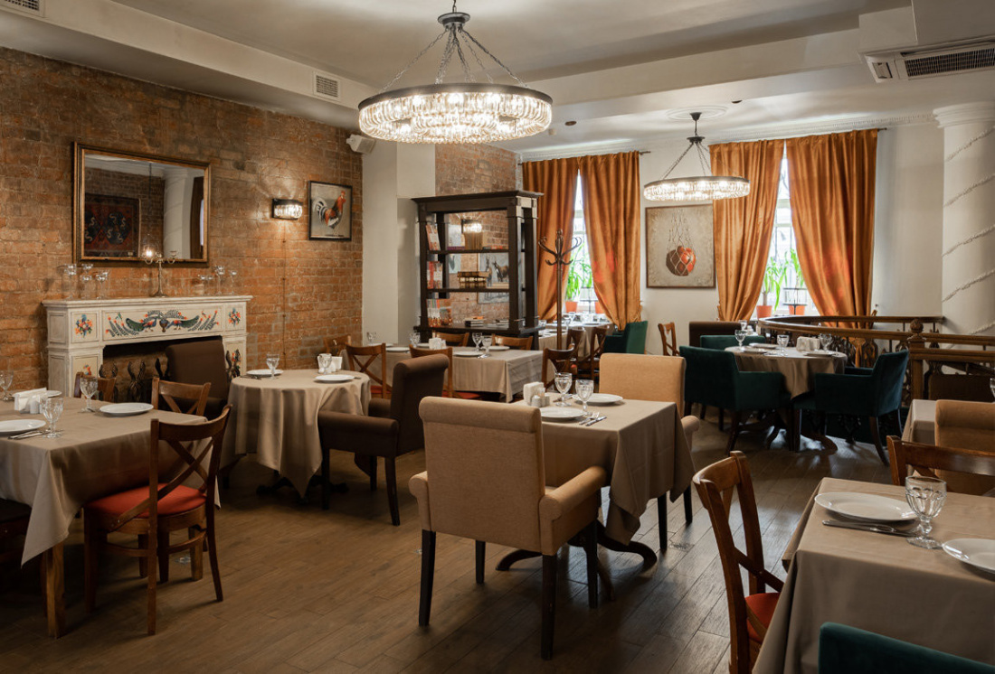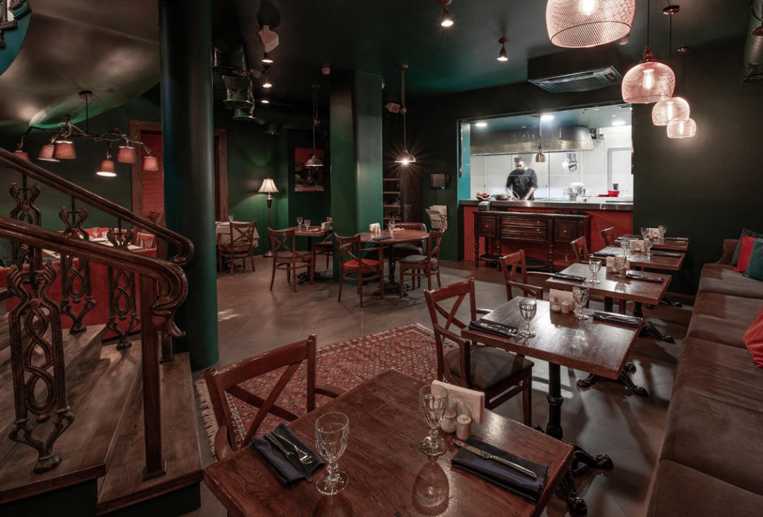 Заведение состоит из двух залов. Один оформлен в приятных светлых тонах, его украшает камин, стеллажи с декором, красивые люстры и картины. Второй зал – стильное сочетание красного и зеленого цвета с минимумом декора и открытой кухней.