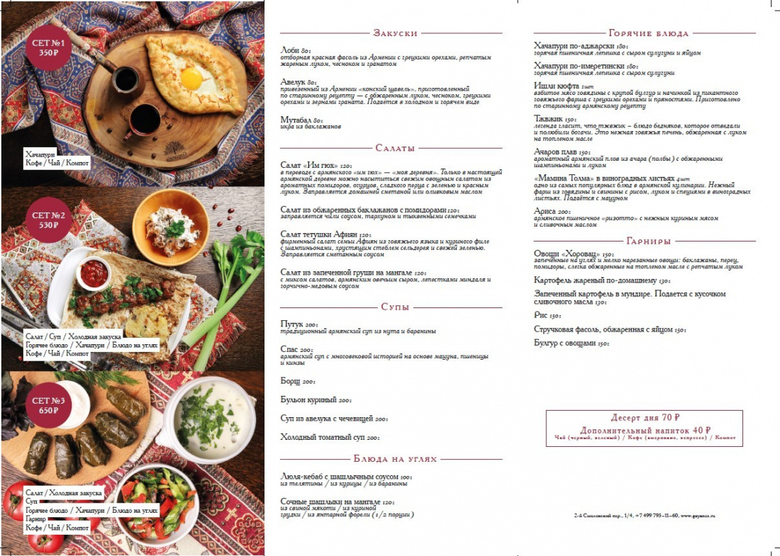 В меню представлены блюда кавказской кухни. Вам предложат попробовать хачапури, ламаджо, домашний пирог со шпинатом, авелук, армянское ризотто, ачаров плов, мамину толму в виноградных листьях, плов из булгура, яичницу с помидорами и зеленью и много других не менее вкусных блюд.