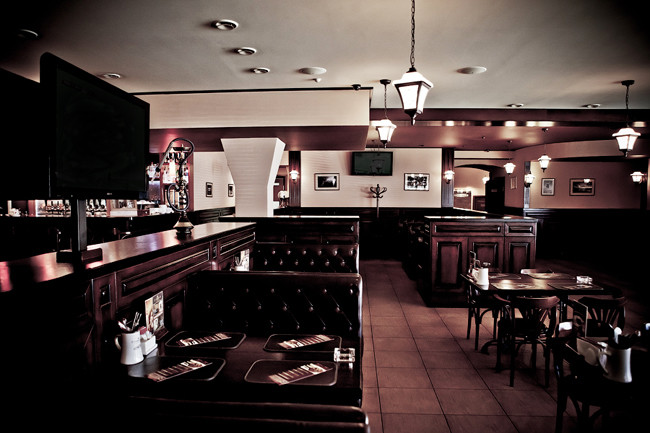 Интерьер выполнен в стиле респектабельного пивного ресторана с темной деревянной мебелью и большим количеством плазменных экранов. По будням гостям предлагают бизнес-ланч, кроме того, здесь регулярно проходят спортивные трансляции и есть банкетный зал.