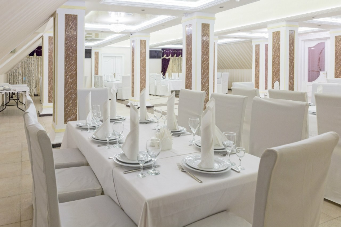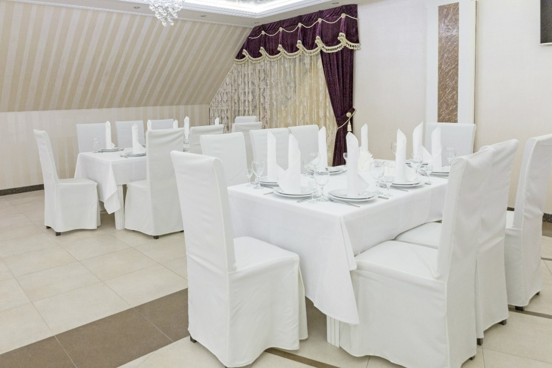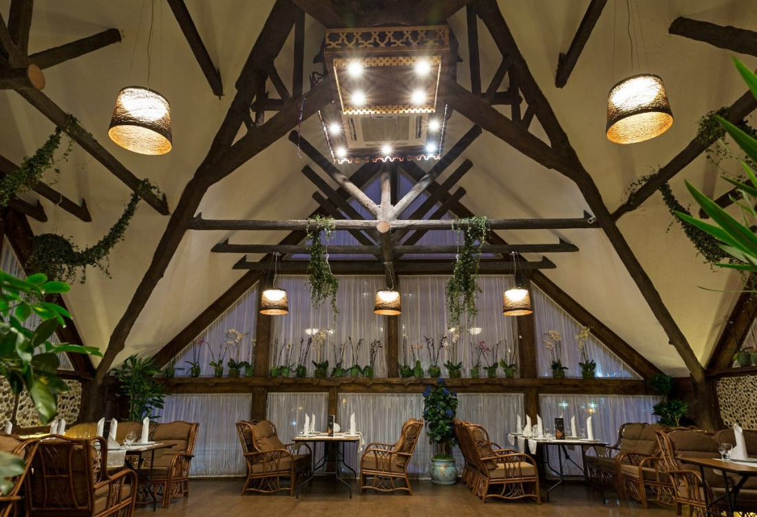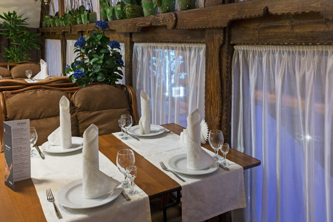 В ресторане есть несколько залов, отдельное помещение для караоке и зимний сад. Для приятных летних вечеров в ресторане открыта терраса и специальное освежающее меню. А для посетителей с малышами есть детская площадка с цветным домиком и горкой.
