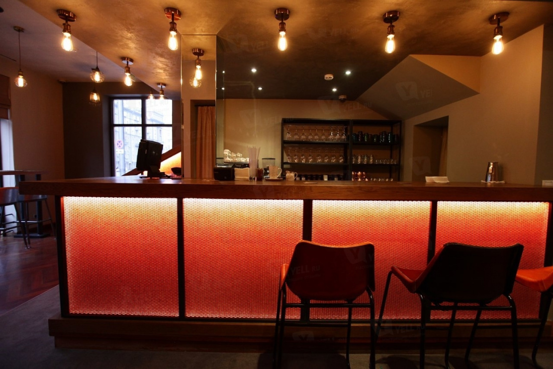 На втором этаже размещается непосредственно ресторан – светлое и гармоничное пространство за счёт больших панорамных окон и продуманного освещения. На окнах – римские ролл-шторы, на полу – натуральный паркет.