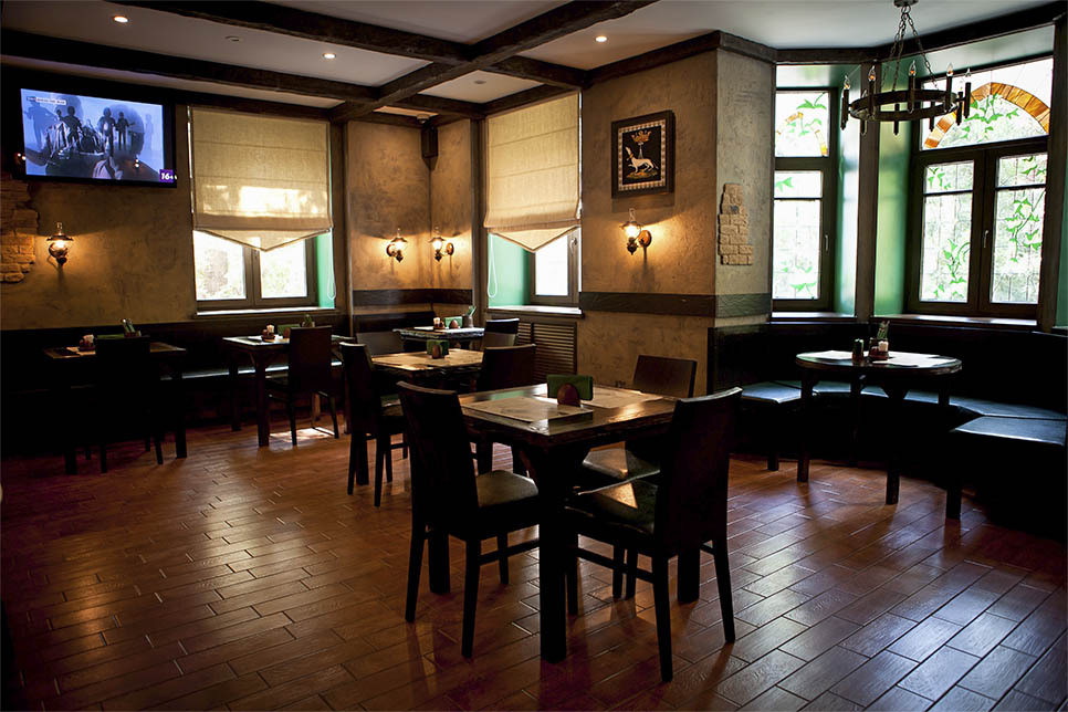 Стиль интерьер напоминает викторианский замок - винтажные окна, люсты в виде подсвечников и большое обилие кирпича на стенах и кожи в мебели. Заведение способно вместить до 70 человек. Для тех, кто работает в центре, есть бизнес-ланчи по привлекательным ценам.