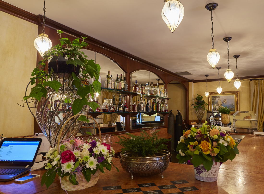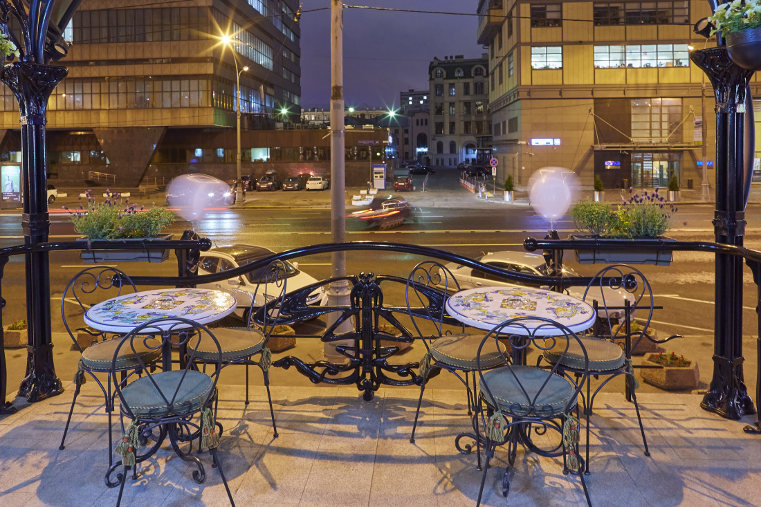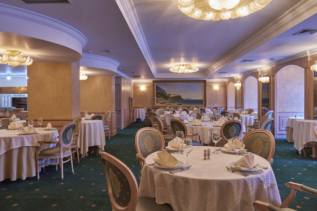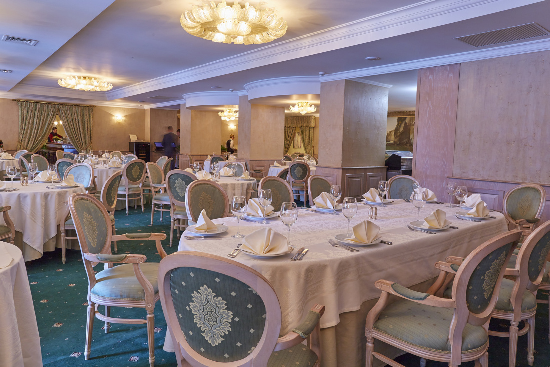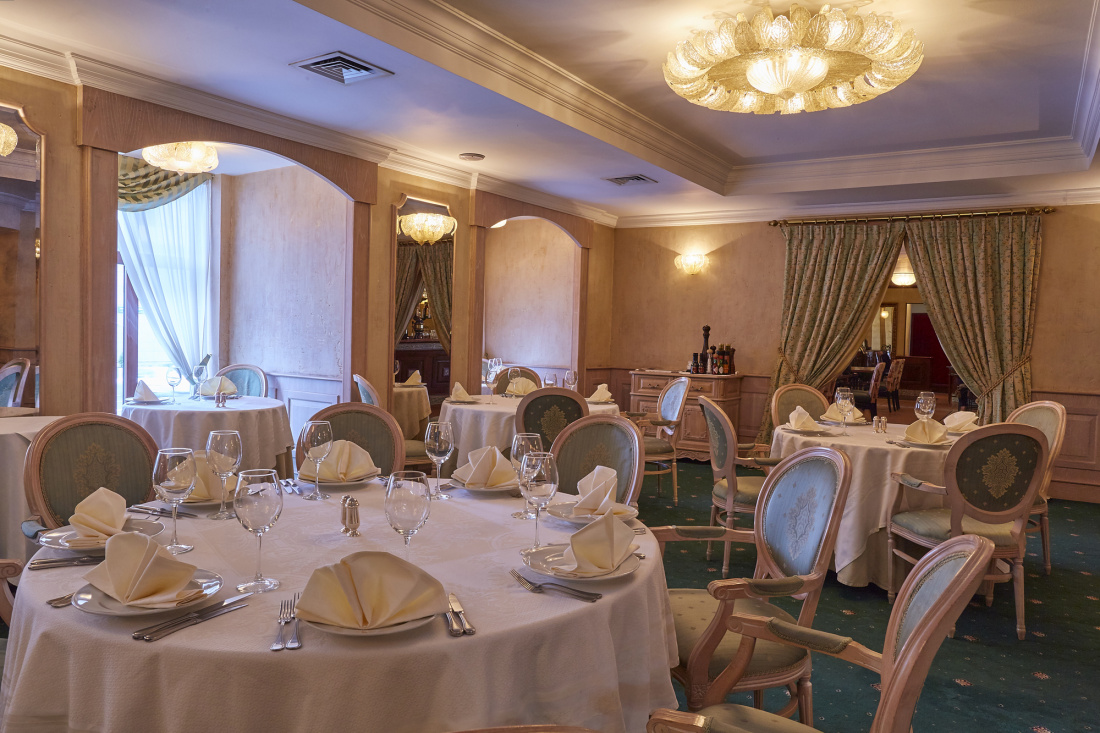 Интерьер выполнен в светлых тонах с живописными картинами на стенах, элегантной мебелью и белым роялем. Здесь можно провести банкет или праздничное мероприятие на различное количество гостей. Кроме того, по будням в ресторане предлагают бизнес-ланнч.