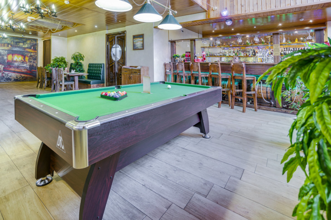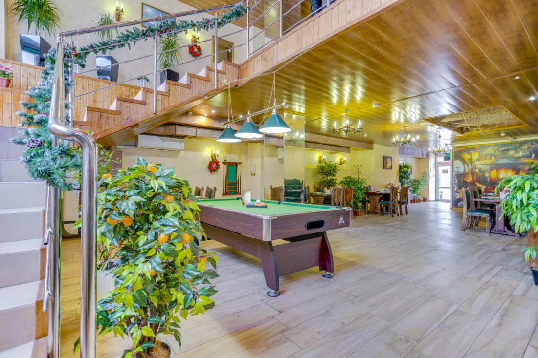 Интерьер кафе оформлен в приятных светлых тонах, в залах расположена массивная деревянная мебель, посреди зала – огромный бильярный стол. Для детей здесь оборудована игровая зона.