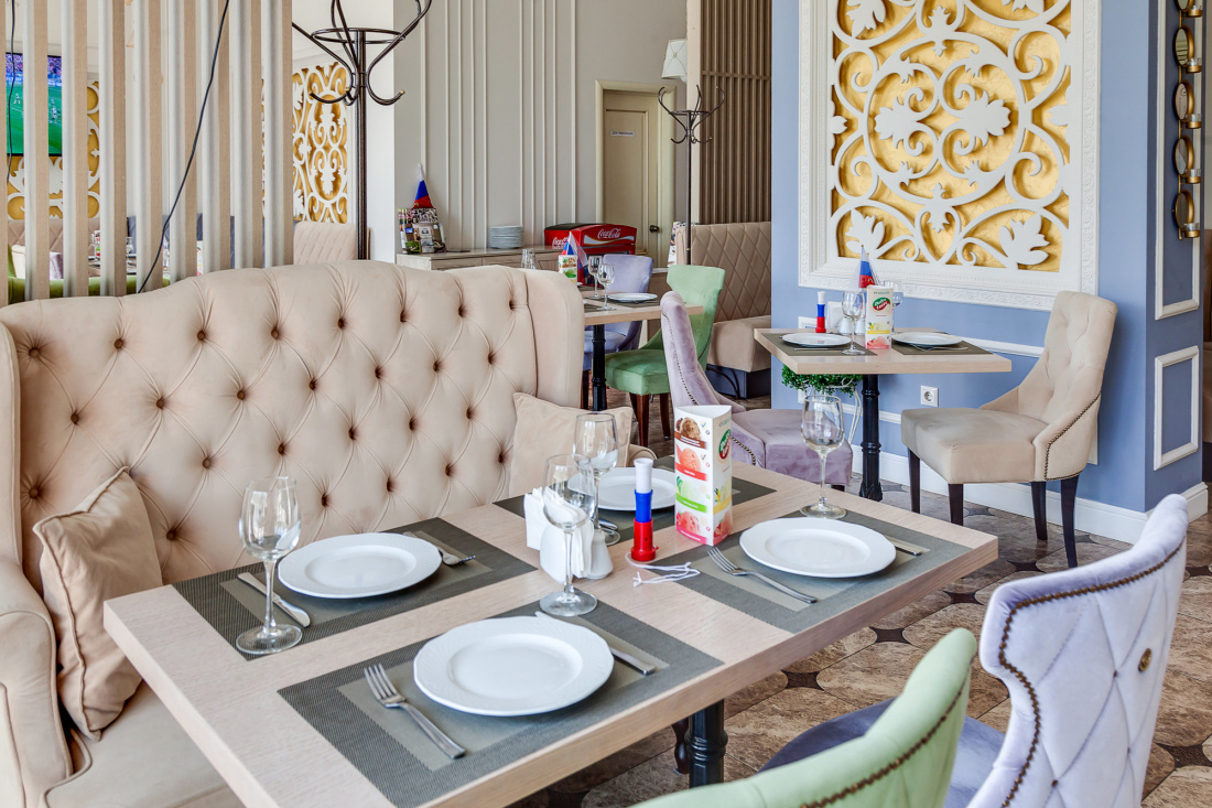 Интерьер понравится любому гостю: светлые залы, панорамные окна, изысканная мягкая мебель, необычные люстры и цветы в рост человека. Здесь царит атмосфера роскоши и спокойствия, хочется задержаться подольше, расслабиться после трудного дня.