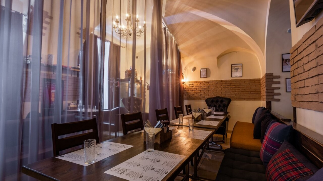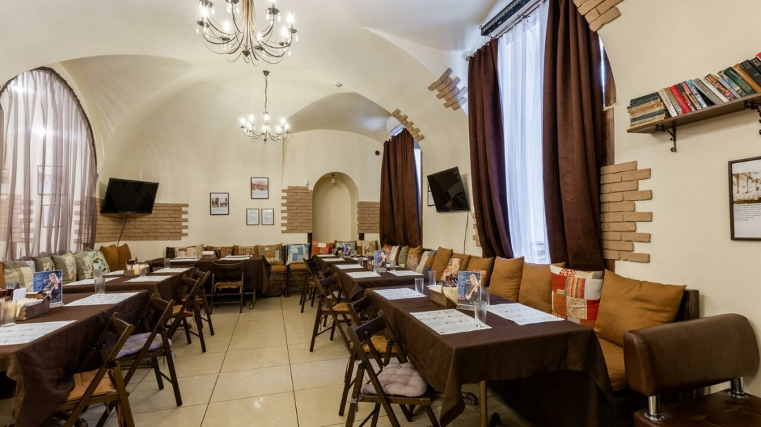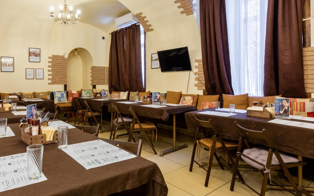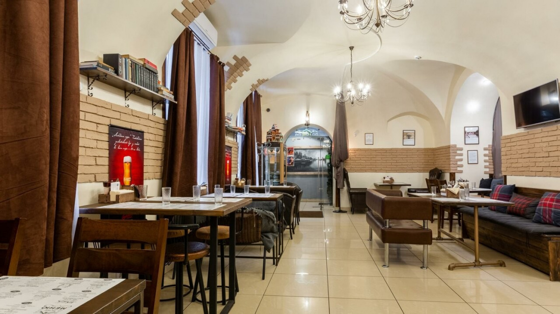 Интерьер заведения оформлен в приятных светлых тонах, создает картинку простая удобная мебель, стильный бар, картины на стенах, а для просмотра любимого спортивного события на стенах размещены плазмы.