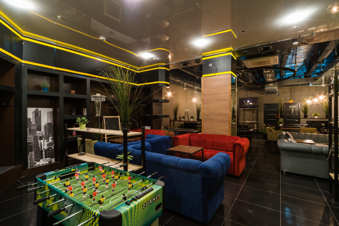 Интерьер заведения – стильный лофт: удобные кожаные диваны, множество зелени и декора, постеры, оригинальное освещение и многими любимый настольный футбол.