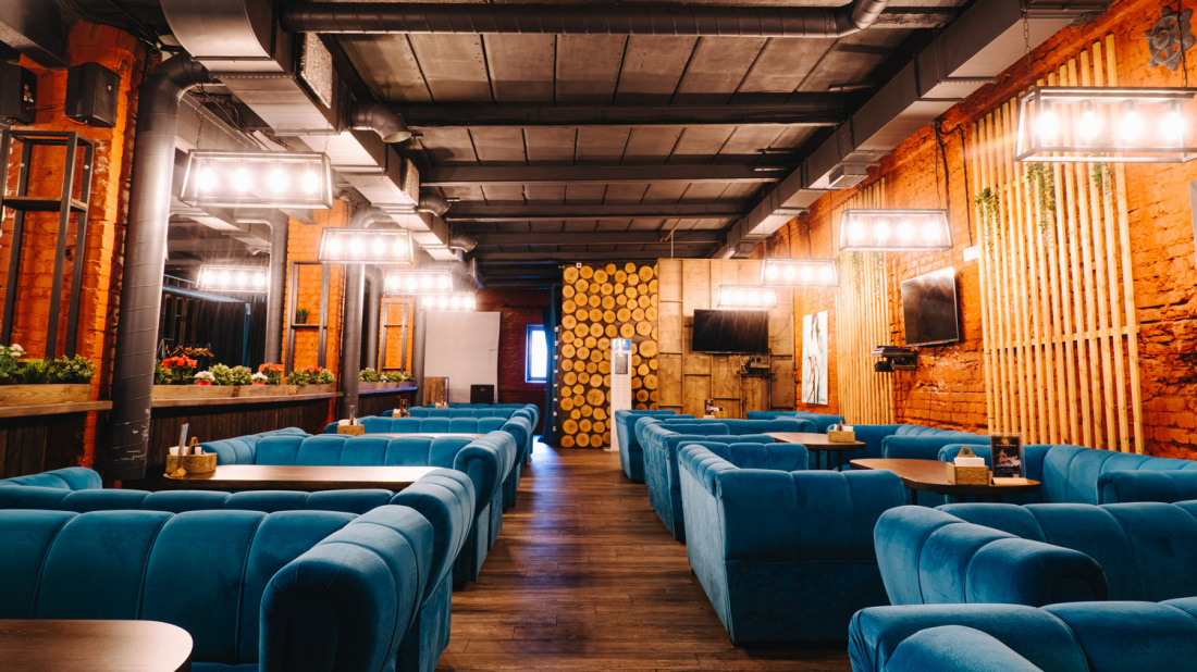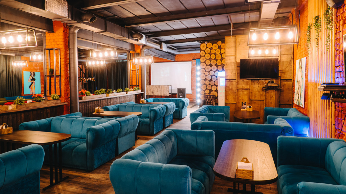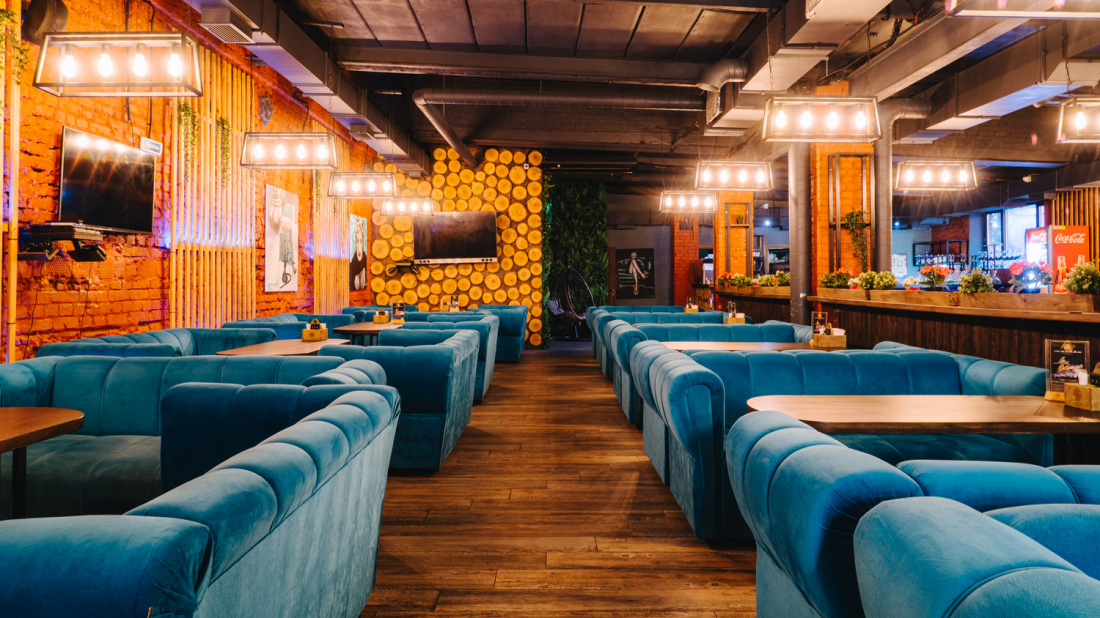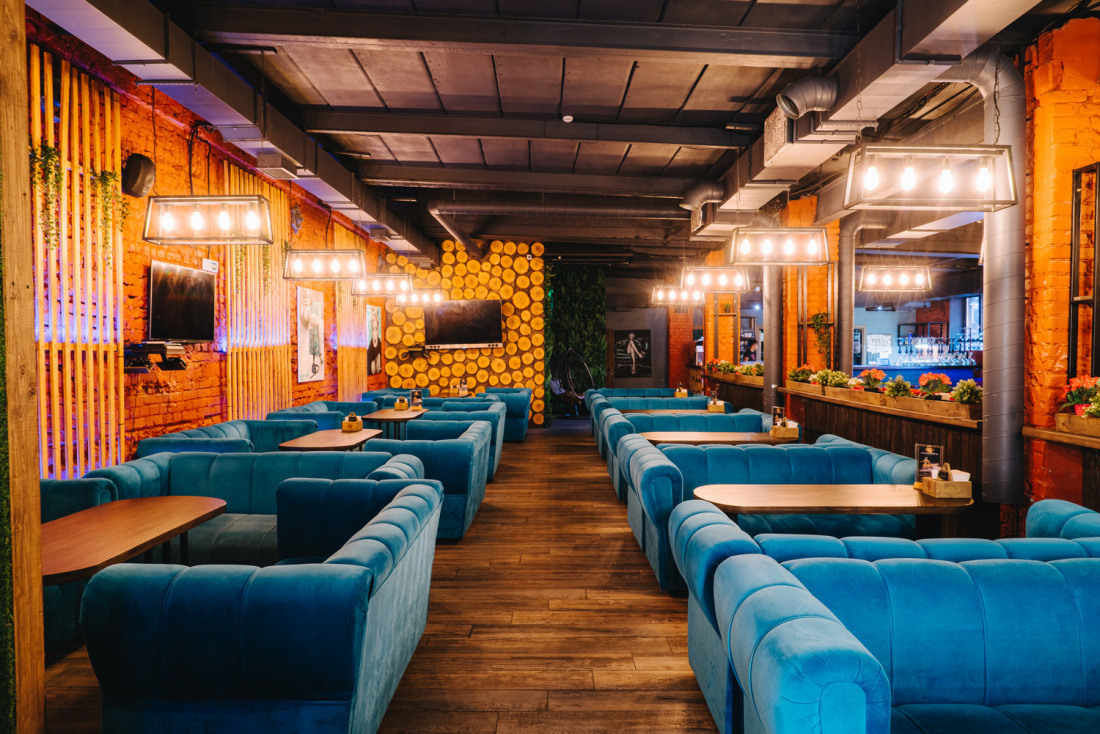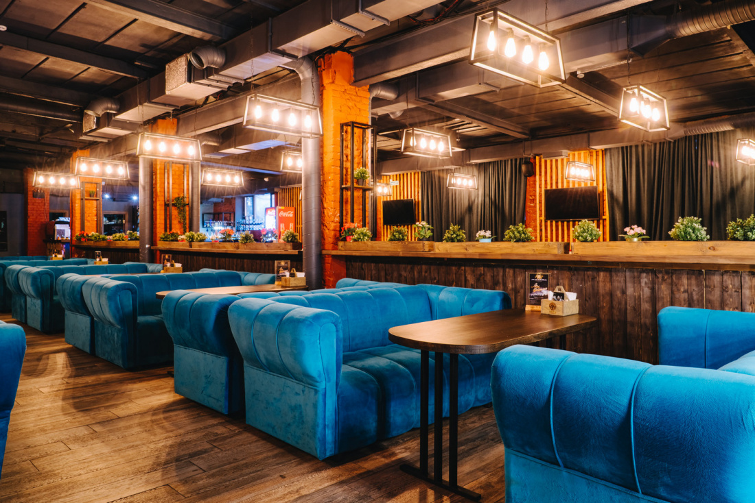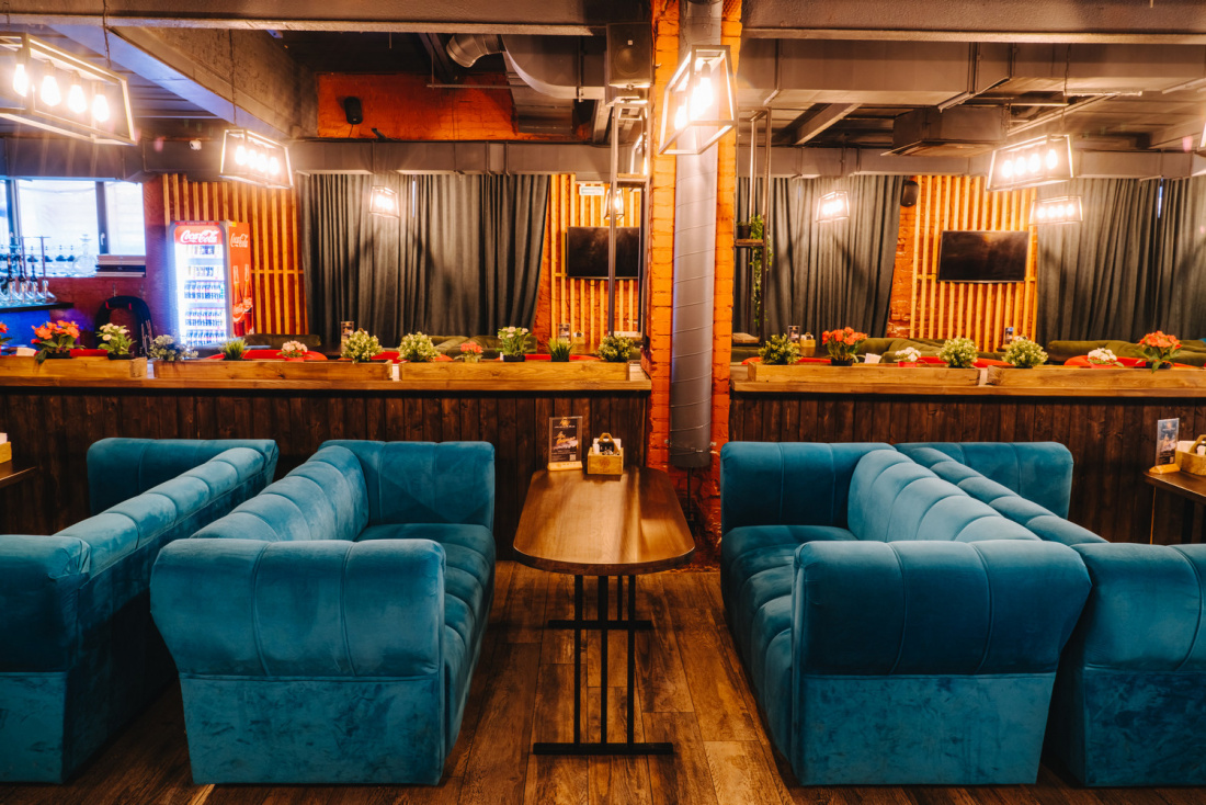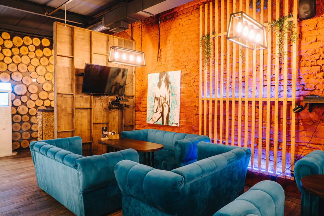 Интерьер заведения оформлен в стиле лофт: кирпичные стены, мягкие диваны, простой декор и приглушенный свет. Отдельное оборудована вип-комната.