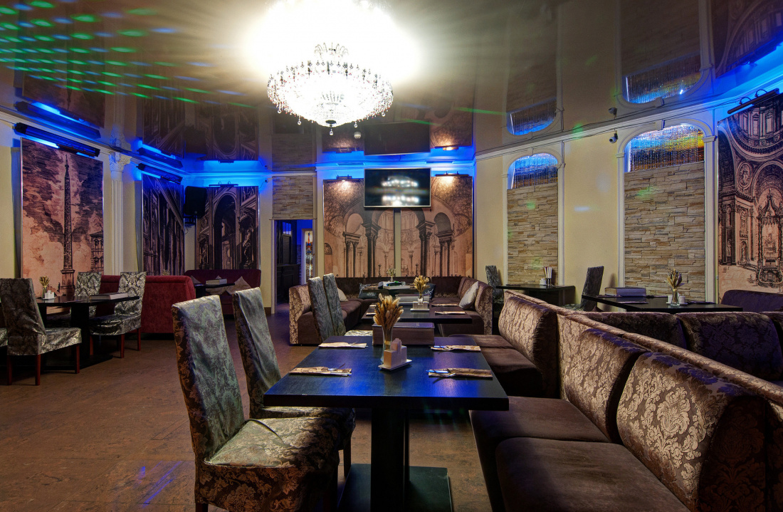 Интерьер заведения выполнен просто и одновременно интересно. Простая мягкая мебель, красивая хрустальная люстра и огромные картины на стенах создают правильную атмосферу.