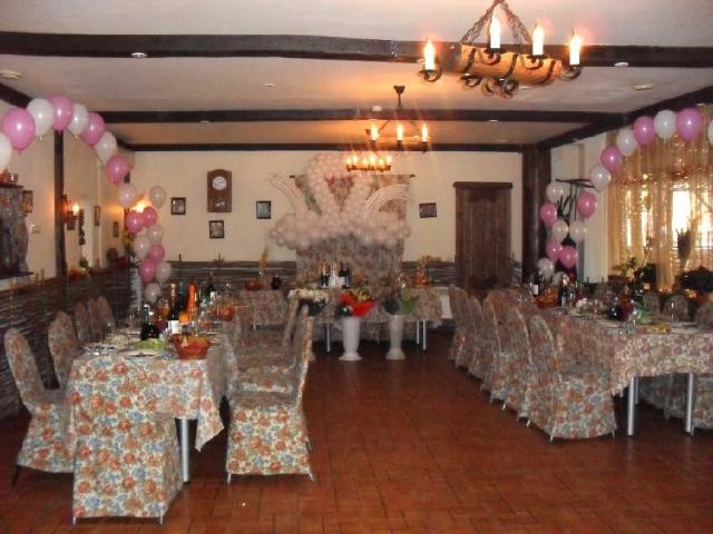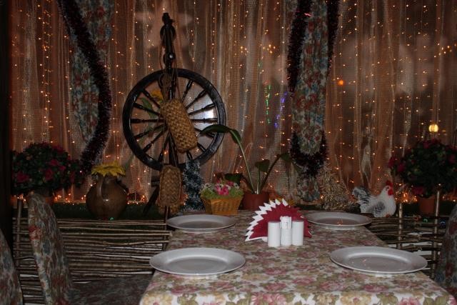 Белёные стены оформлены деревянными балками, плетёными перегородками из лозы. На полках и тумбах в обоих залах представлены композиции: соломенные шляпы, прялка, плетёные лапти, кувшины, глиняная посуда, вязаные половички, связки овощей. 2 зала способны вместить до 120 гостей.