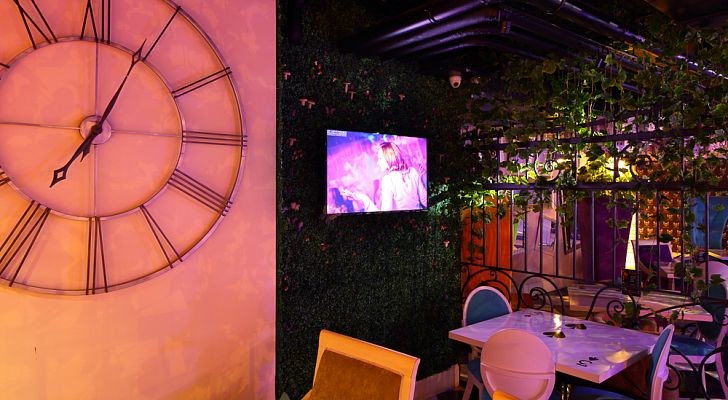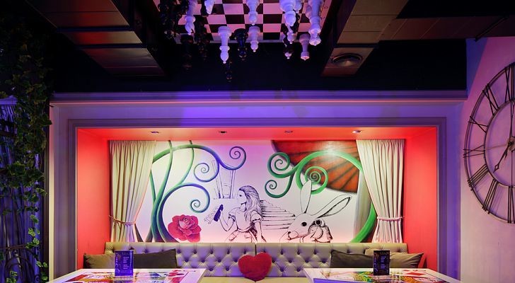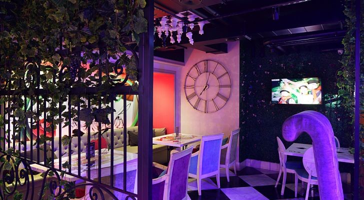 Тематические интерьер выполнен по мотивам сказки Алиса в стране чудес, на стенах иллюстрации чаепития с Чеширским котом, в честь которого и назван бар. Посетители также могут попеть в караоке.