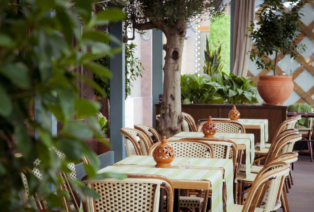 Интерьер ресторана оживлен большим количеством зелени, а те, кто пришел в ресторан за десертами - ждет открытая прилавка с обширным выбором сладостей. По утрам здесь можно позавтракать, а оплатить счет в заведении можно с помощью банковской карты.