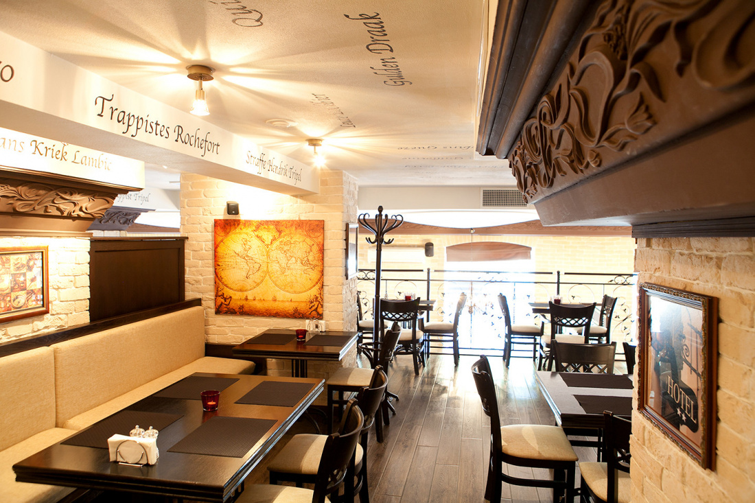 Интерьер обладает всеми чертами, характерными для фламандской брассерии. Удобные столы и стулья из дерева, добротная барная стойка. Стены оформлены декоративным кирпичом песочного цвета. В уютную зону на втором ярусе ведёт лестница с коваными перилами. На одной из стен размещена полка с множеством ячеек, где представлены различные сорта пива. Вдоль высоких окон – мягкие диваны белого цвета. Особый уют создают камин и люстры с плафонами в виде свечей.