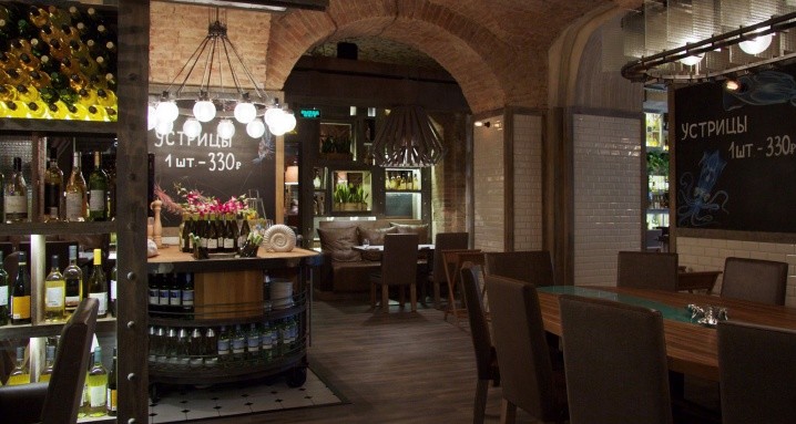 Интерьер ресторана классический, с элементами стиля лофт. Гости могут расположиться на кожаных диванах и за столом на большую компанию.