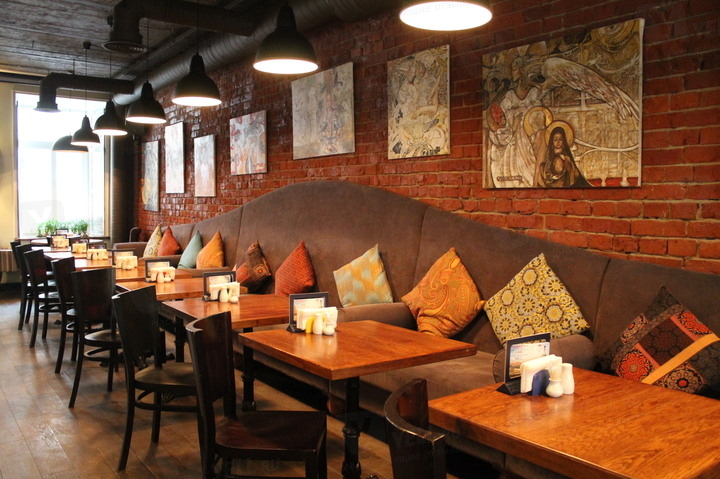 Приглушённые оттенки интерьера разбавляют пестроту расписных стульев, разноцветных подушек и посуды, а приятную атмосферу создаёт живая музыка. Гостям предлагаются скидки, в том числе в день рождения и в дневное время. Есть паровые коктейли, можно провести досуг за настольной игрой.