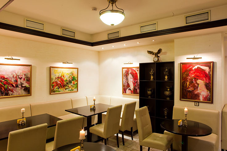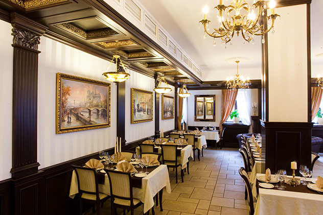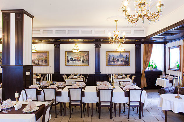 Интерьер создает торжественную и праздничную атмосферу, благодаря камину, изящным люстрам и картинам на стенах. Для вас здесь могут организовать свадьбу или банкет на разное количество гостей. Также, по будням в заведении предлагают бизнес-ланч, а по выходным можно послушать живую музыку.
