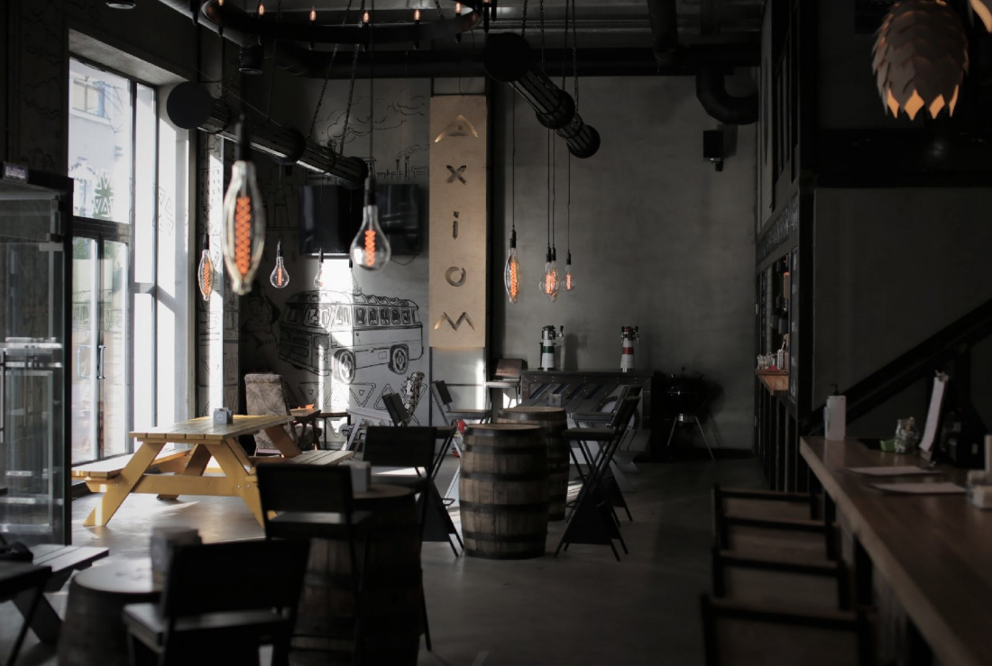 Пивной бар Axiom pub - это довольно брутальный дизайн, серые оштукатуренные стены и потолки. Здесь можно встретиться с друзьями и выпить кружку пива под приятную музыку и в целом отлично приятный вечер.