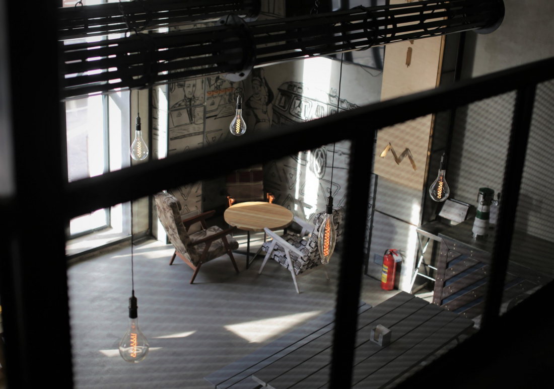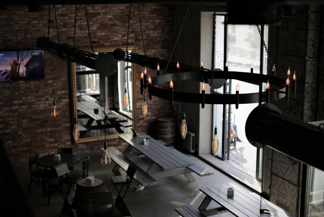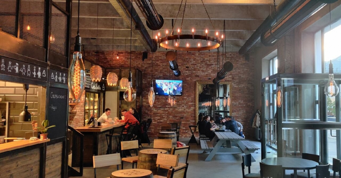 Интерьер паба получился по-настоящему мужским в стиле лофт: кирпичные стены, обилие деревянной мебели, светильники, столы в виде бочек.