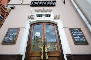 Интерьер бара полностью выдержан в армейской тематике. Входные двери Разведки декорированы двумя автоматами Калашникова.