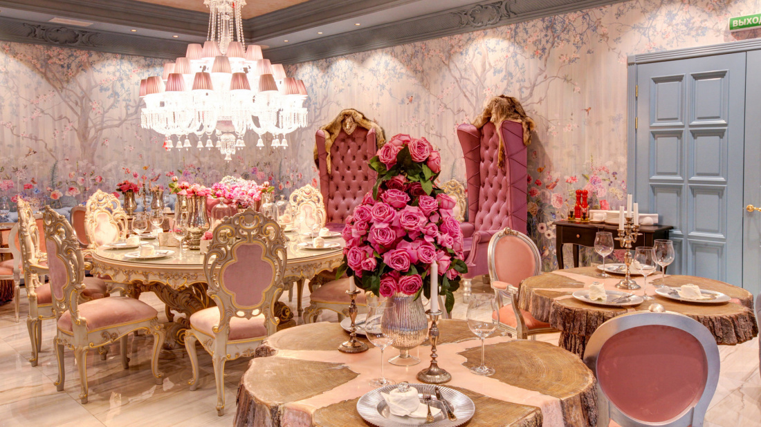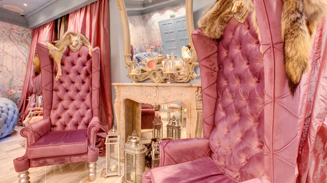 Интерьер действительно шикарно оформлен и выполнен в легких розовых оттенках, особую атмосферу создают огромные розовые кресла, голубые диваны, красивая люстра, камины, цветы, зеркала в пол.