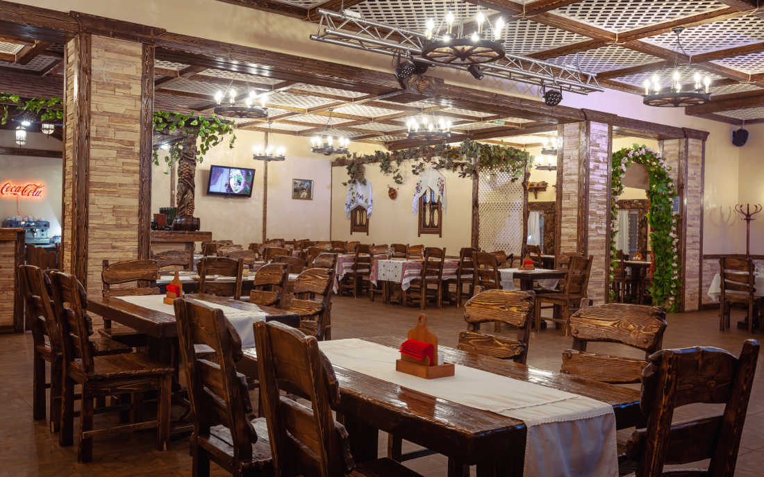 Массивная деревянная мебель, рушники на окнах, картины и необычные люстры помогут создать правильное настроение. Зал Casa Maria готов принять до 100 гостей.