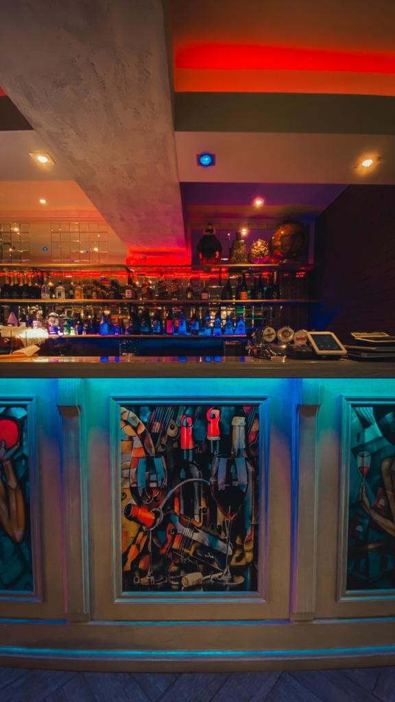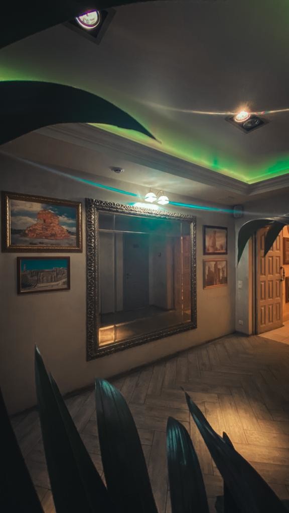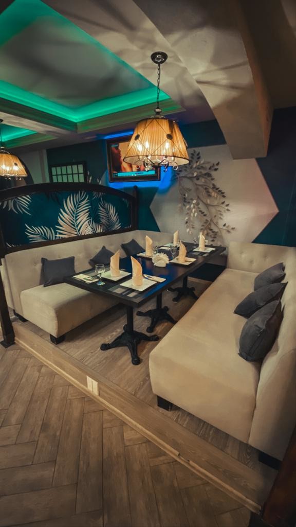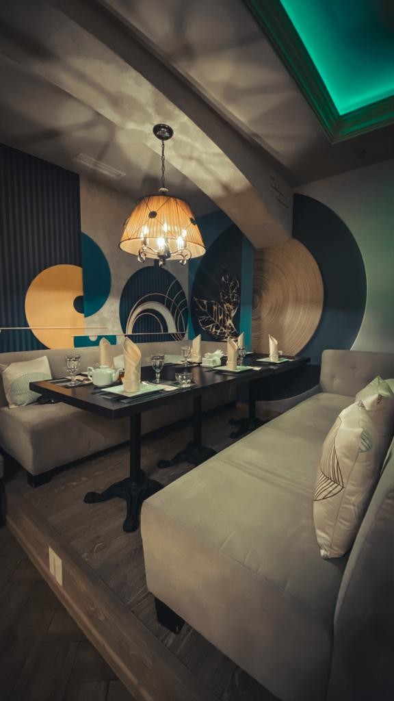 Интерьер заведения оформлен в классическом стиле с элементами модерна. Гости могут расположиться на удобных диванах, создают атмосферу уюта подсветки в потолке, оригинальные лампы-свечки, зеркала в золотых рамках, настенные картины и большой бар.