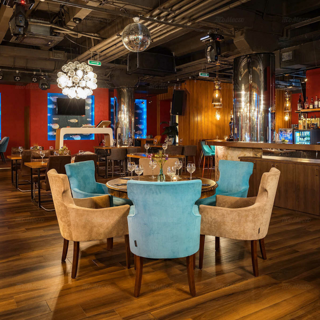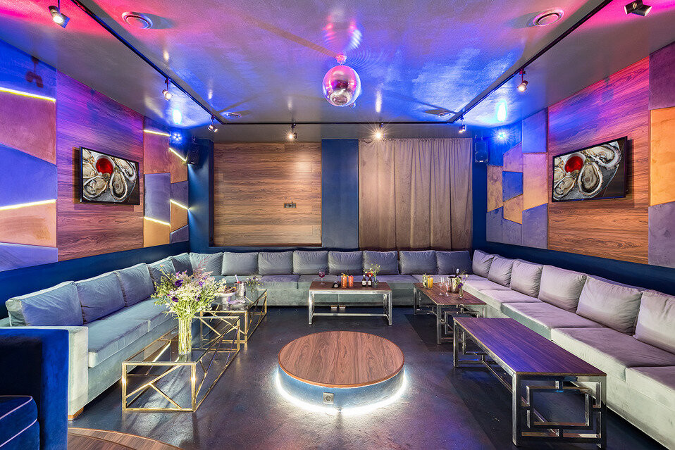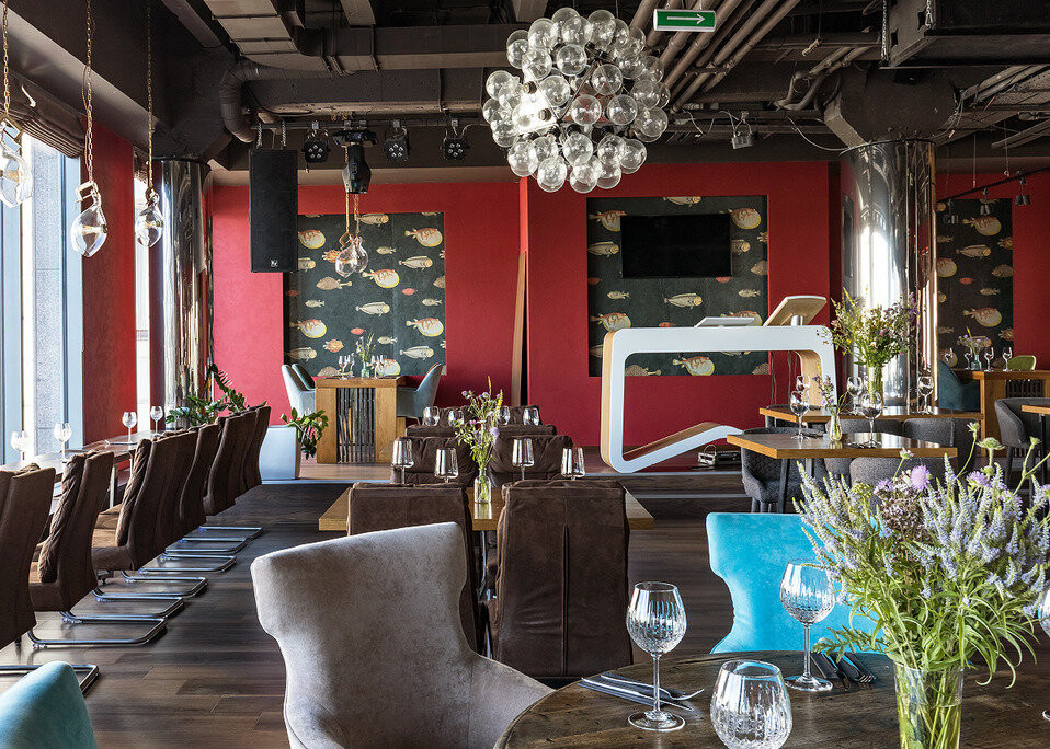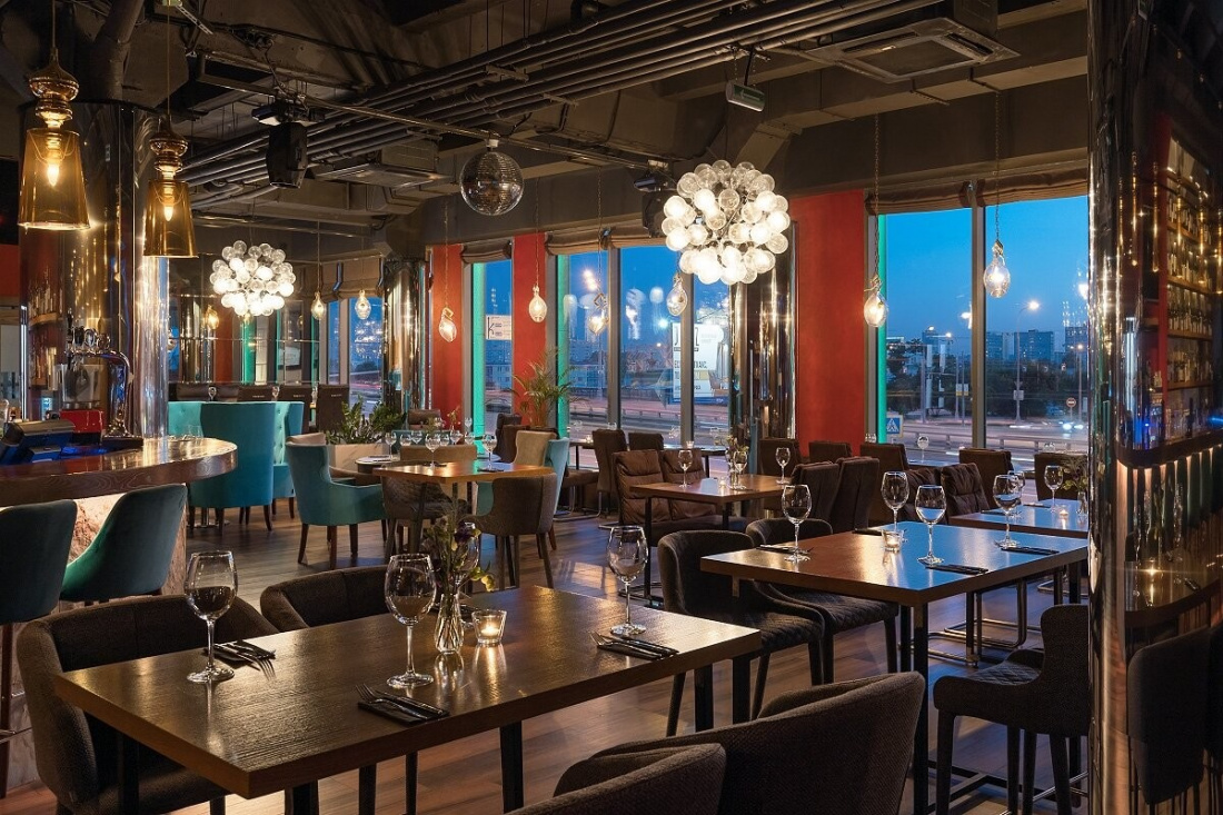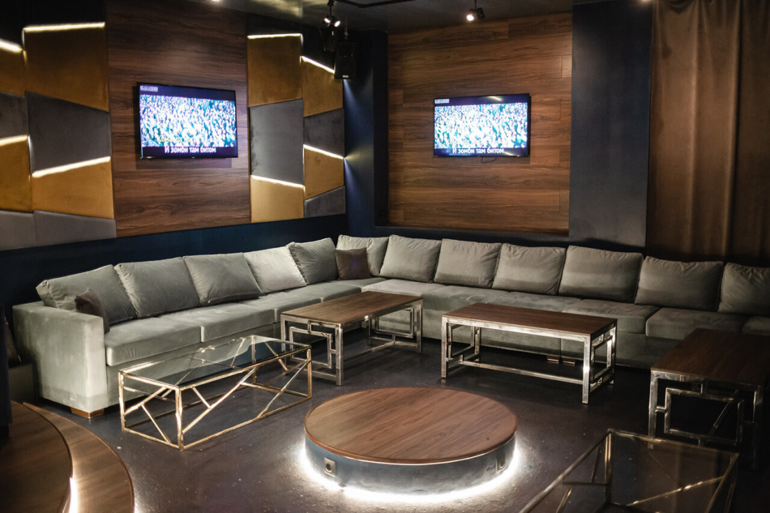 Дизайн интерьера поражает своей красотой: мягкие кожаные кресла, люстры-шары «рыбий глаз» и стеклянные абажуры на латунных цепях, натуральные материалы и приглушенный свет идеально сочетаются с лаконичными формами.Так же есть отдельная зона караоке в яхт-стиле и панорамный вид на Москву со второго этажа.