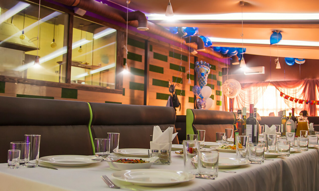 Интерьер оформлен просто и со вкусом. Гостей ждут уютные диванчики, сцена для выступлений и множество зелени в качестве декора. Также в ресторане проводятся банкеты, в вашем распоряжении: проекторы, плазмы, микрофоны и караоке. Также сотрудники заведения могут помочь в выборе диджеев и ведущих, фотографов и видеооператоров.