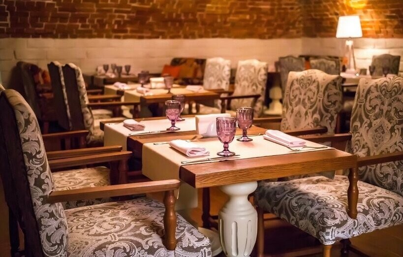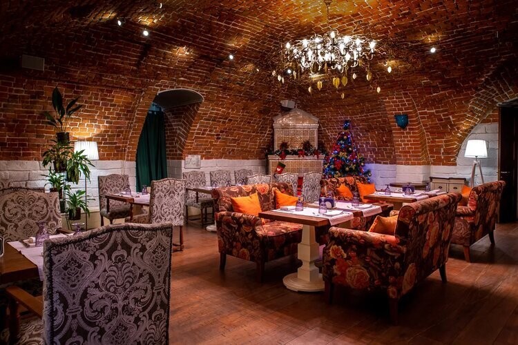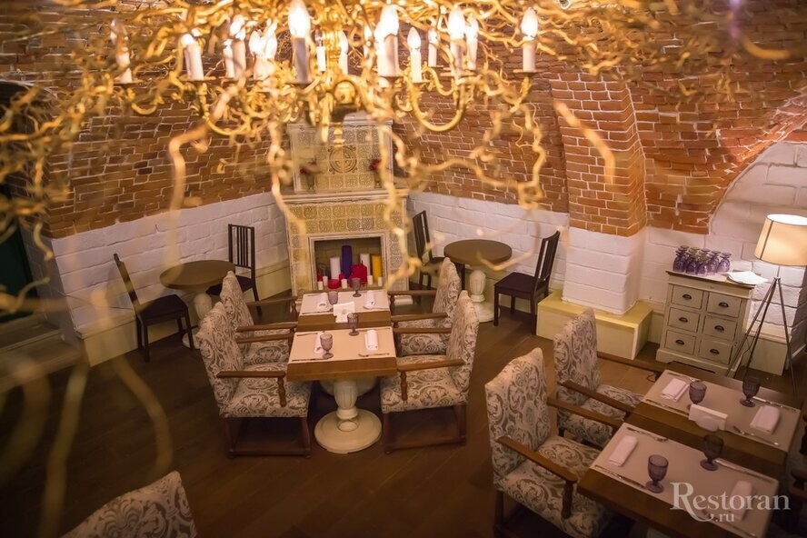 Интерьер заведения запомнится надолго: кирпичные стены, потолки необычной формы, удобная мягкая мебель, зелень в качестве декора и шикарные люстры.