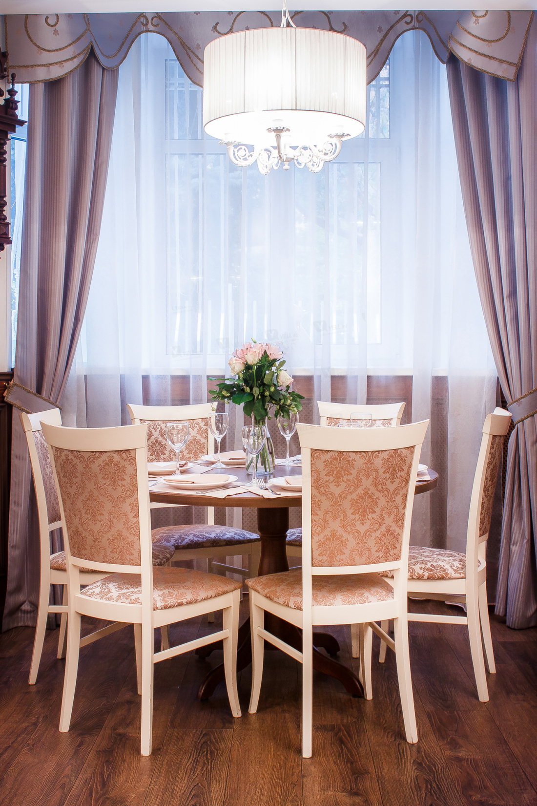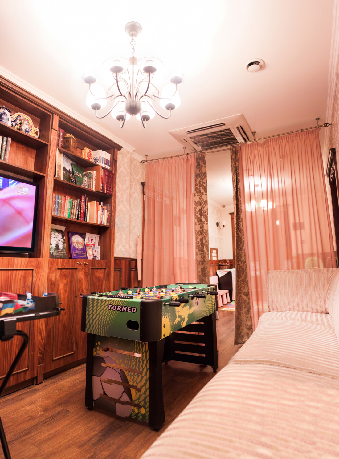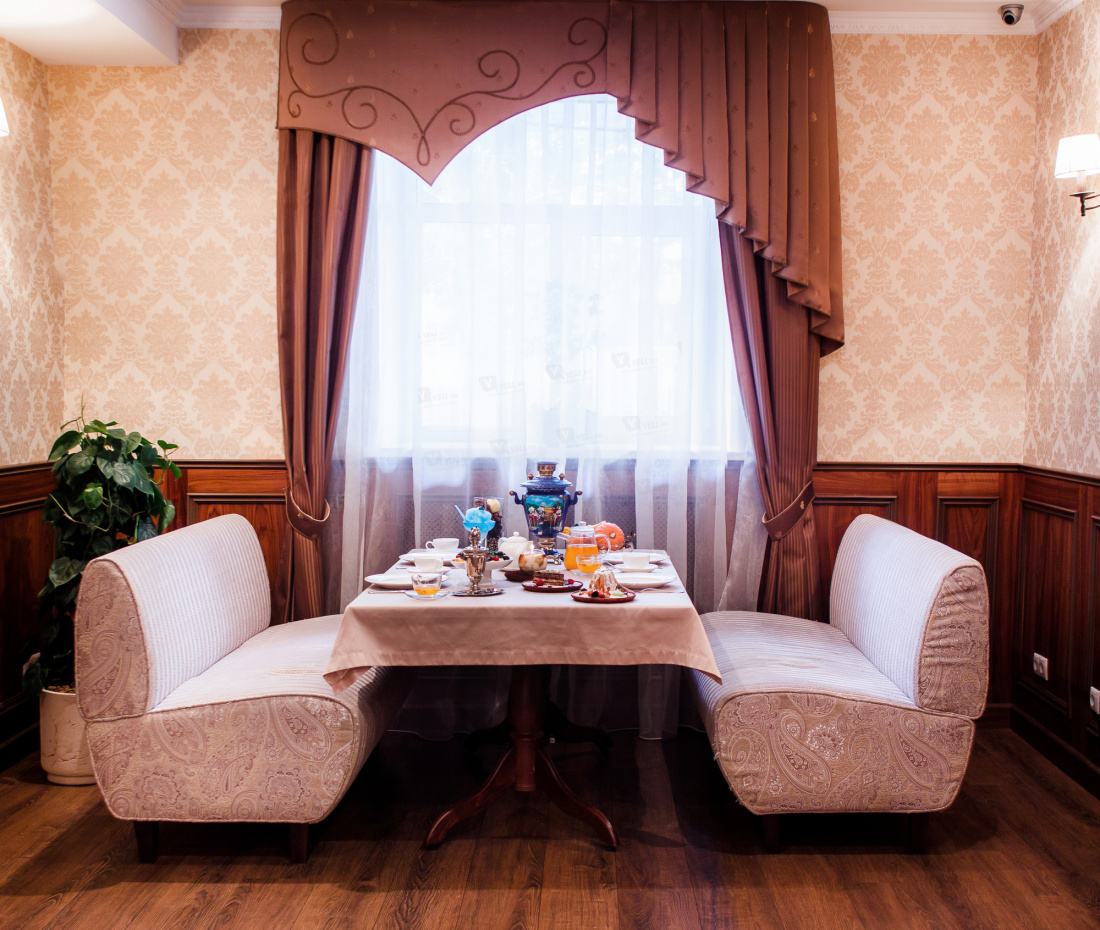 В заведении воссоздан интерьер русского дворянского дома 19 века с занавесками, резными стульями, деревянными шкафами. Есть большой банкетный зал на 140 человек и комната для караоке. Играет спокойная музыка, звучат романсы.