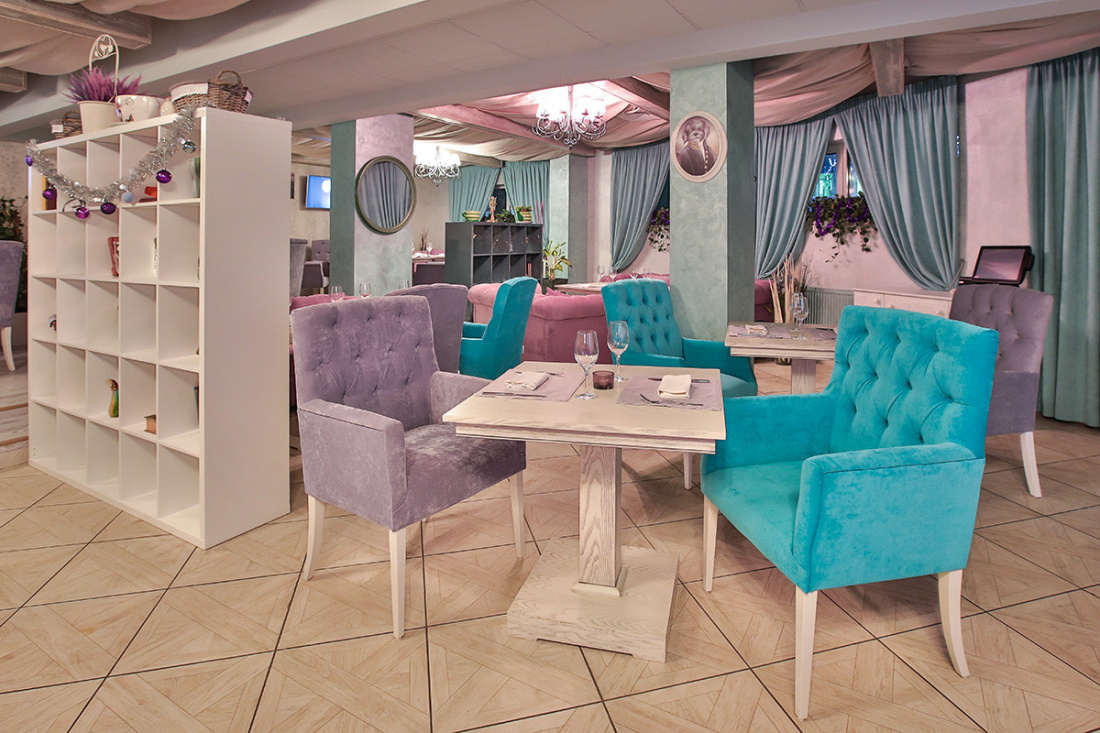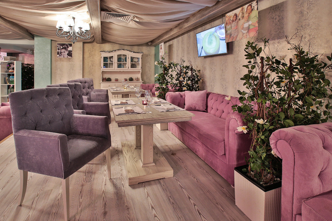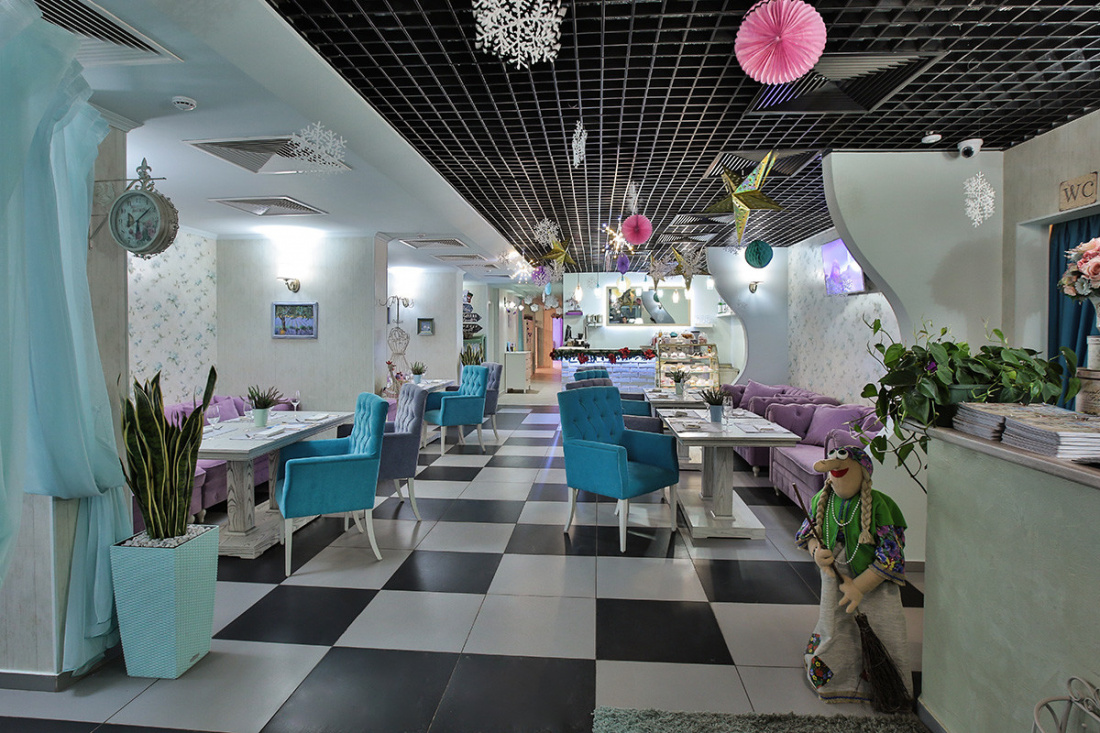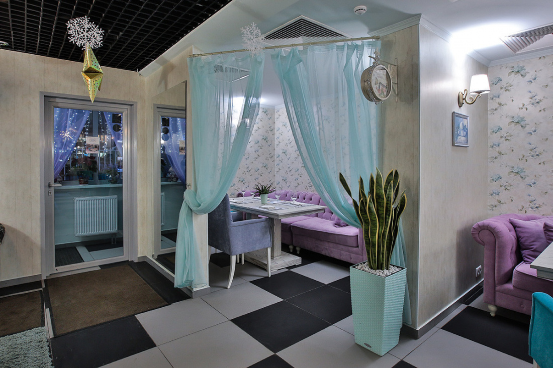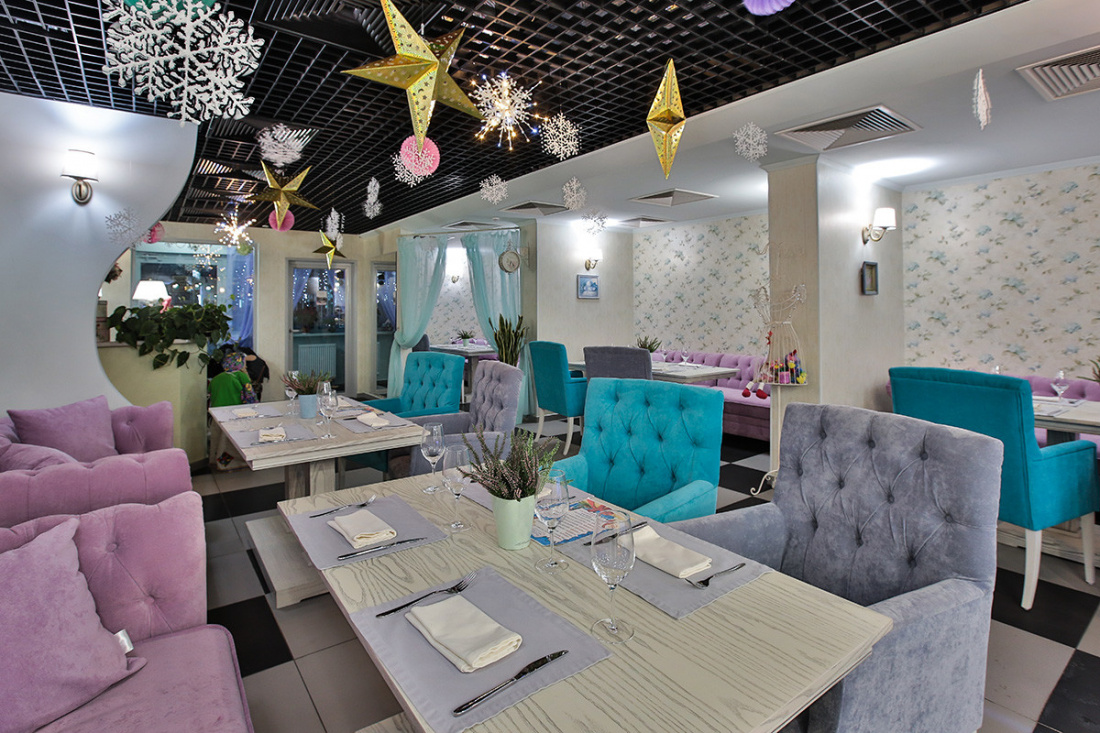 Интерьер кафе оформлен стильно и с душой. Благодаря светлым оттенкам, бархатной мебели и милому декору создается праздничная атмосфера. В кафе можно не только уютно пообедать с семьей, но и отметить торжество. А для маленьких гостей здесь предусмотрена отдельная игровая зона.