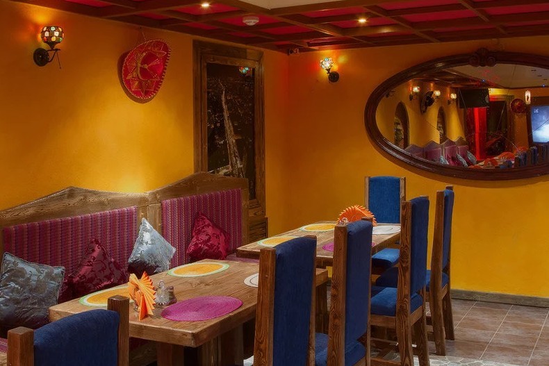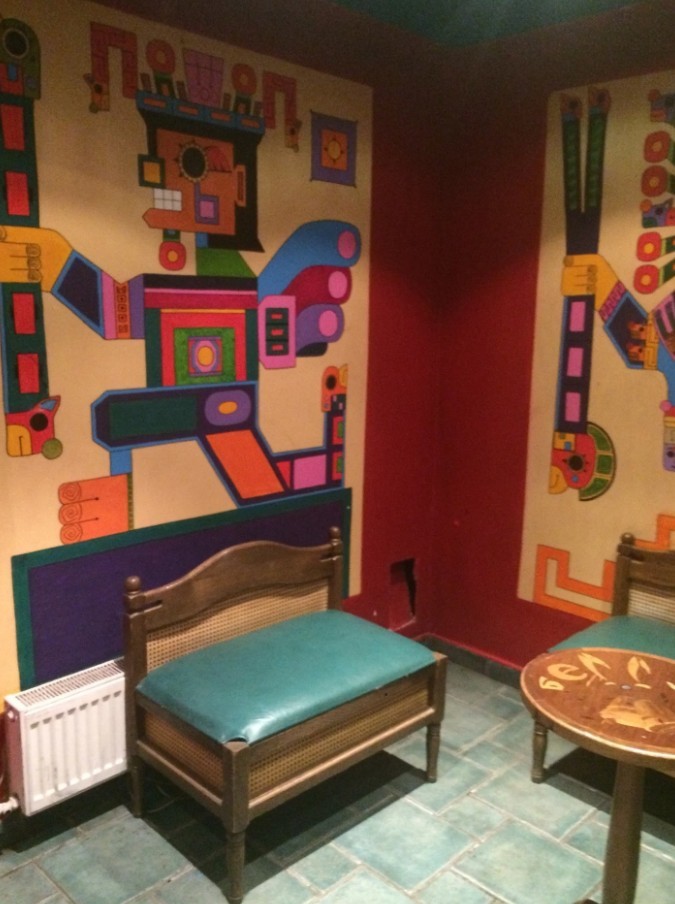 Интерьер отражает колорит Мексики. В оформлении зала доминируют яркие тона. Радуют взор разноцветные салфетки, разложенные на массивных деревянных столах, барельефы, изображающие головы львов, и сомбреро, развешанные по стенам. Диваны усыпаны большим количеством подушек.
