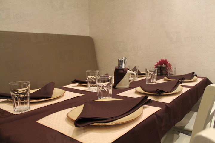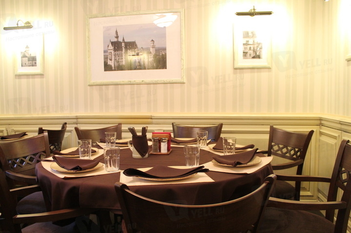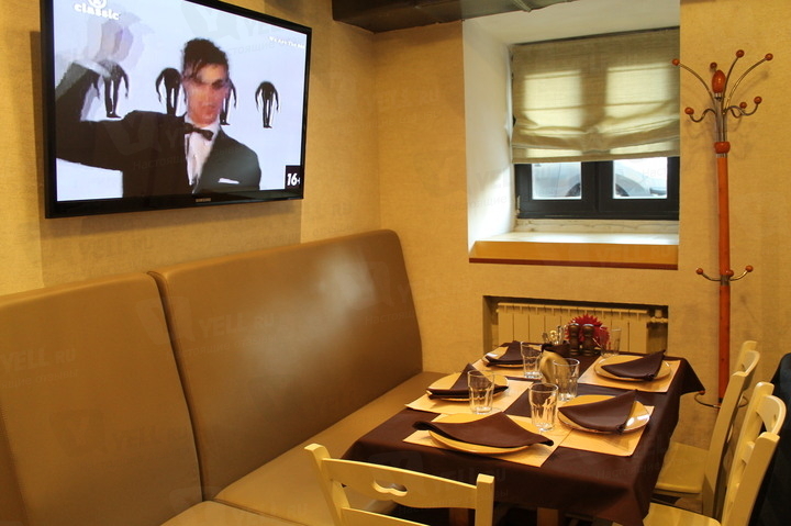 Помещение ресторана оформлено в классическом стиле с мягкими диванами и добротными стульями из тёмного дерева. Потолок украшает оригинальная подвесная конструкция из деревянных пластин.